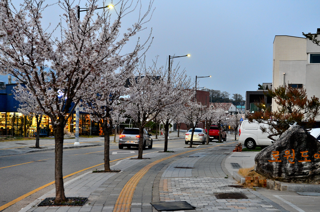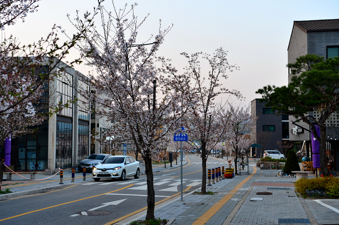 아직 지지 않은 벚꽃 가로수가 마을 도로에 운치를 더해 준다.