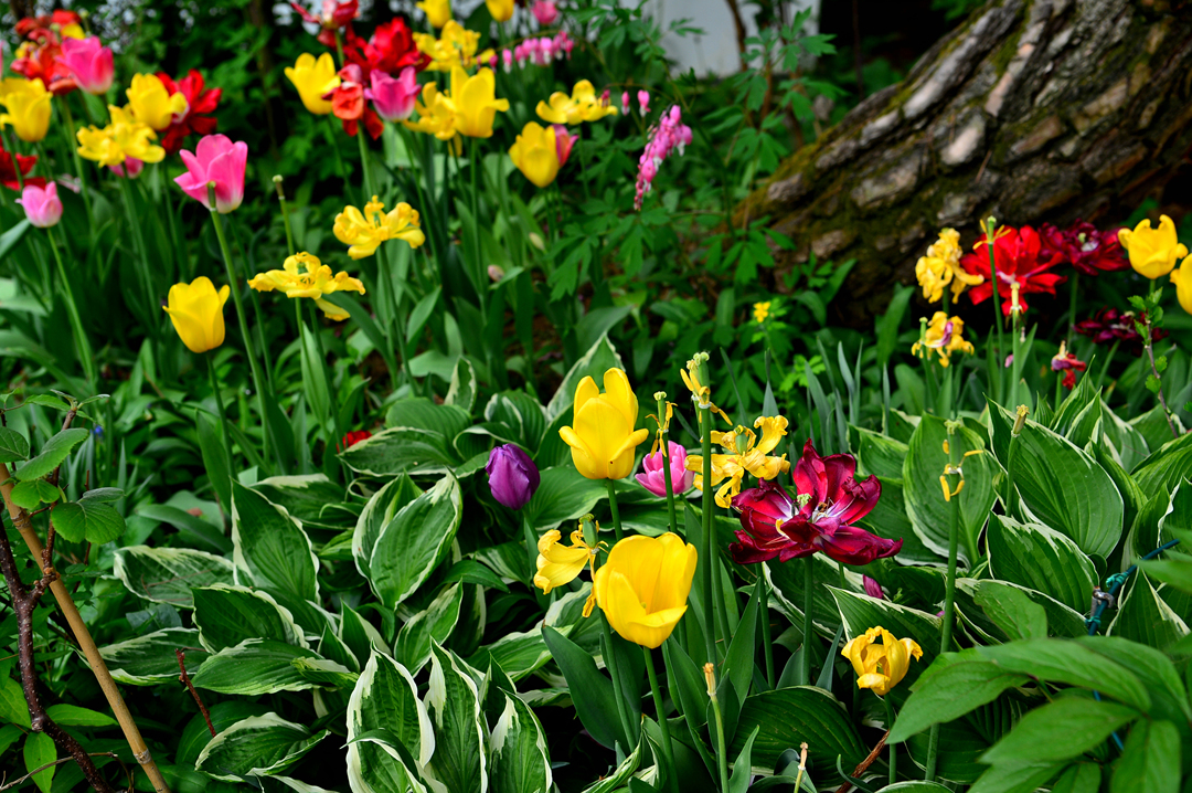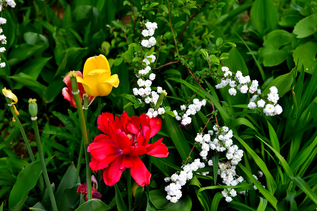 정원은 아름다운 꽃들로 가득 차 있다.