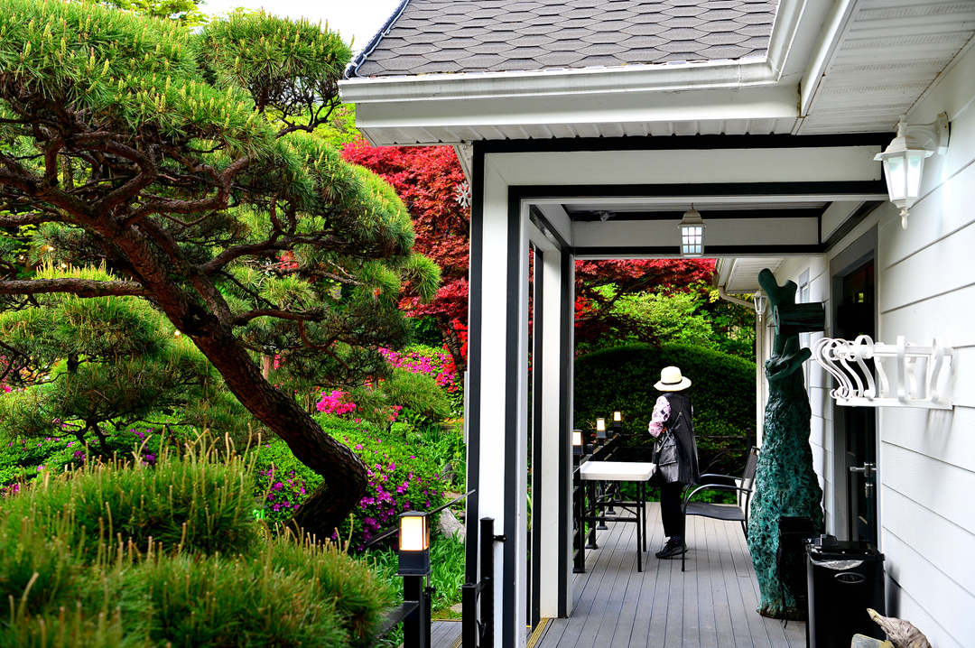 계곡을 바라보는 정원의 가장자리에는 편하게 휴식을 취할 수 있는 벤치들이 나란히 놓여 있다.