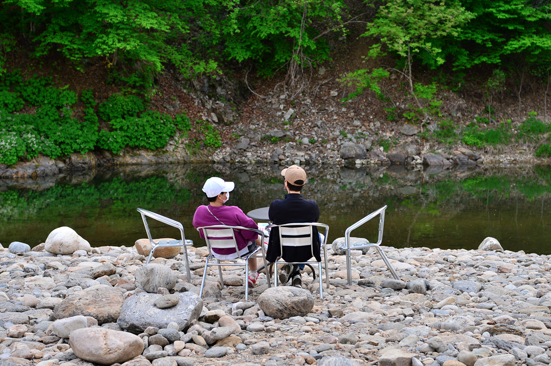 물가에 앉아 있는 부부의 모습에서 행복감이 전해온다.