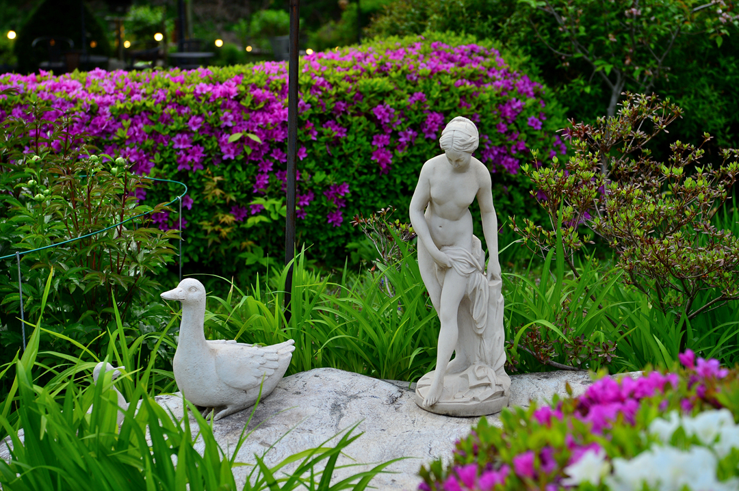 정원의 꽃들 사이에서 아름다운 처자가 멋진 몸매를 과시하고 있다.