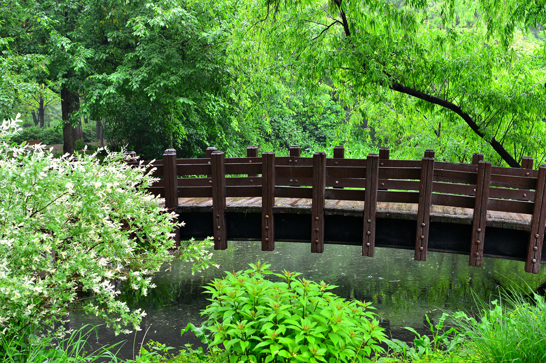 숲길의 작은 목재다리도 비에 흠뻑 젖었다.