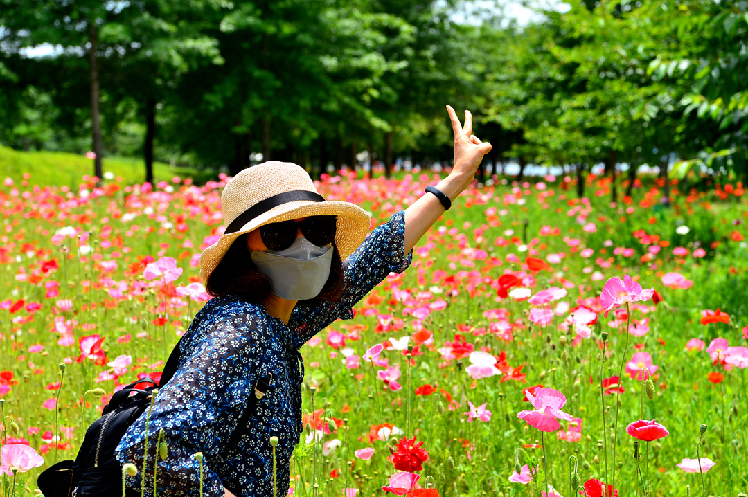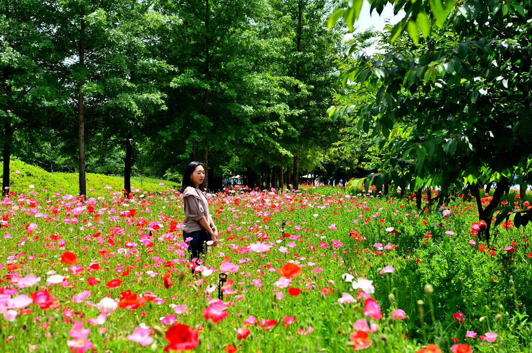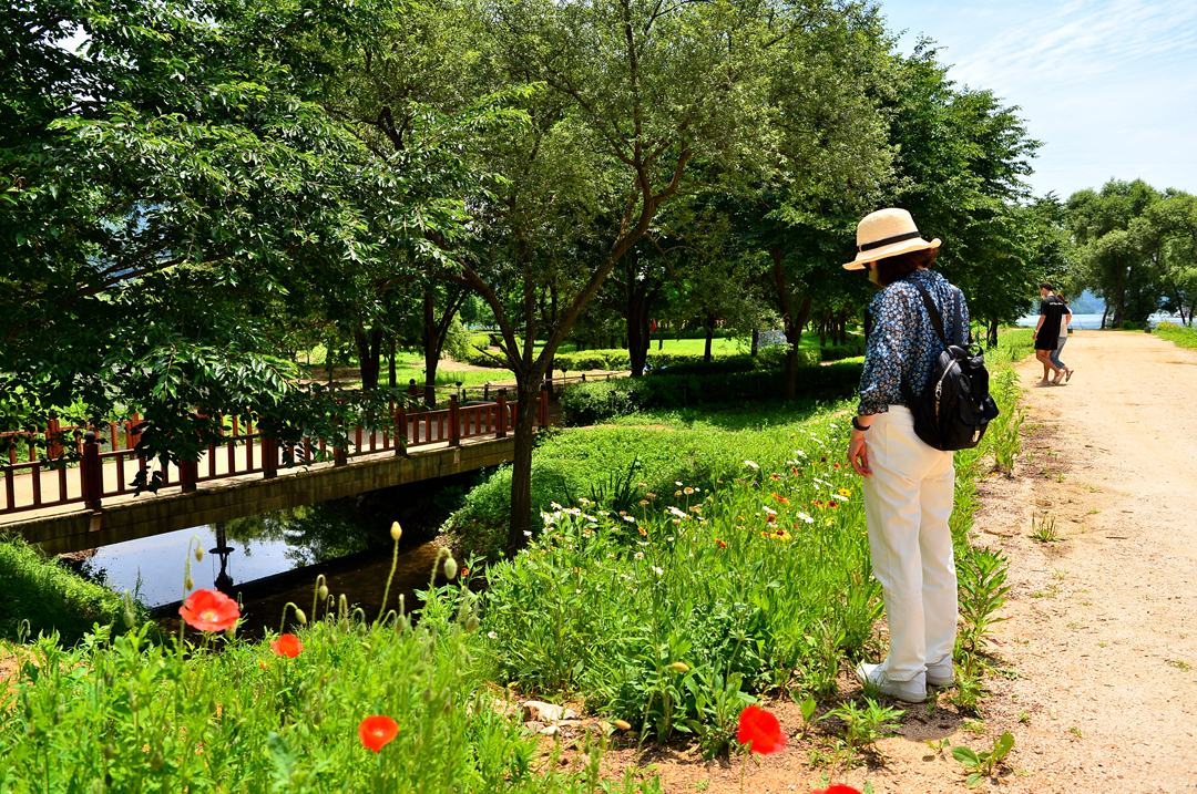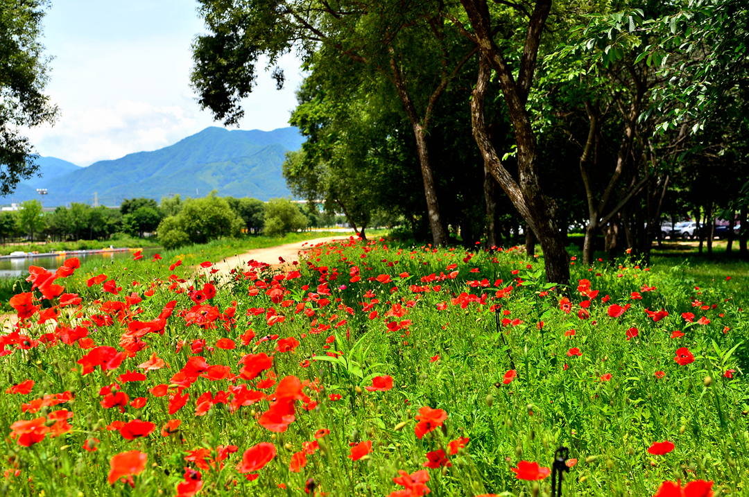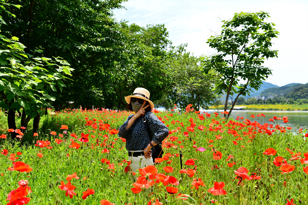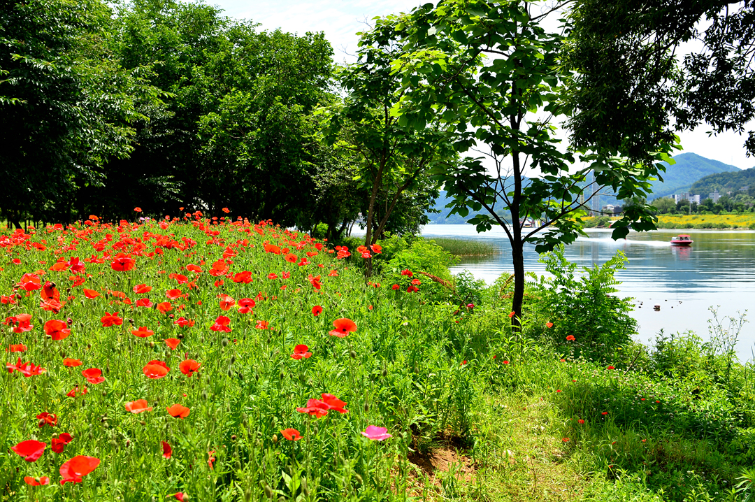 산책로를 따라서 양귀비가 지천으로 피어 있다.