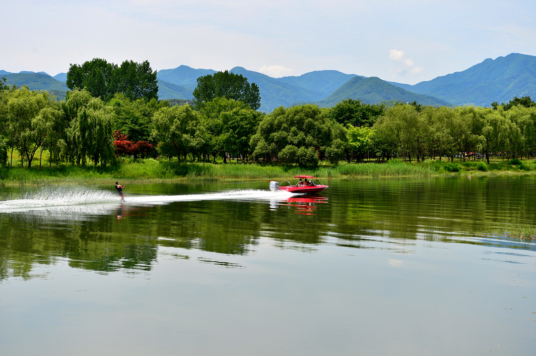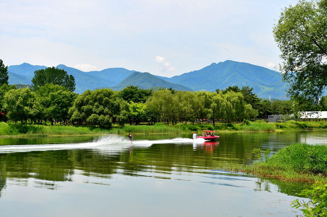 자라섬 주변의 수면을 가르는 수상 스키어 모습도 한 폭의 그림이다.