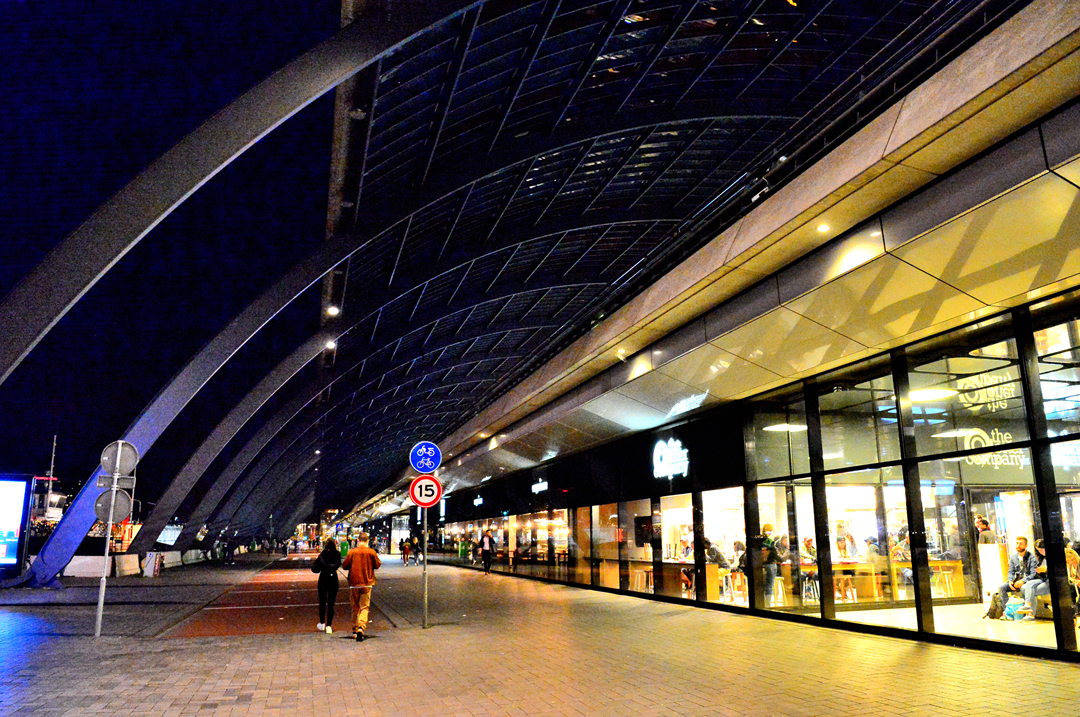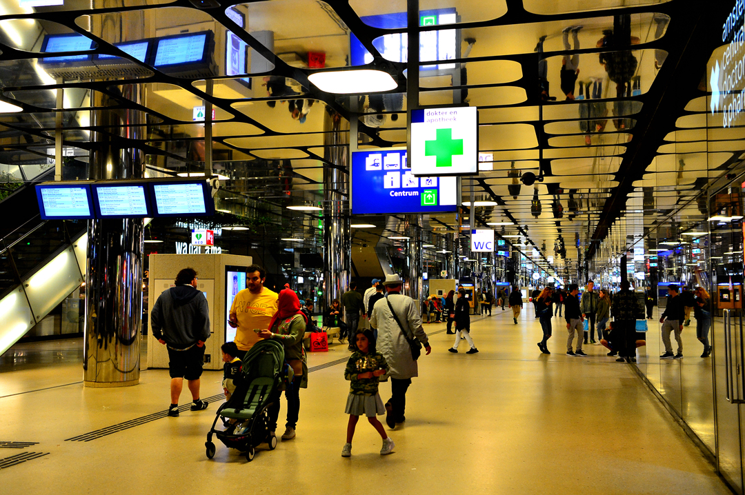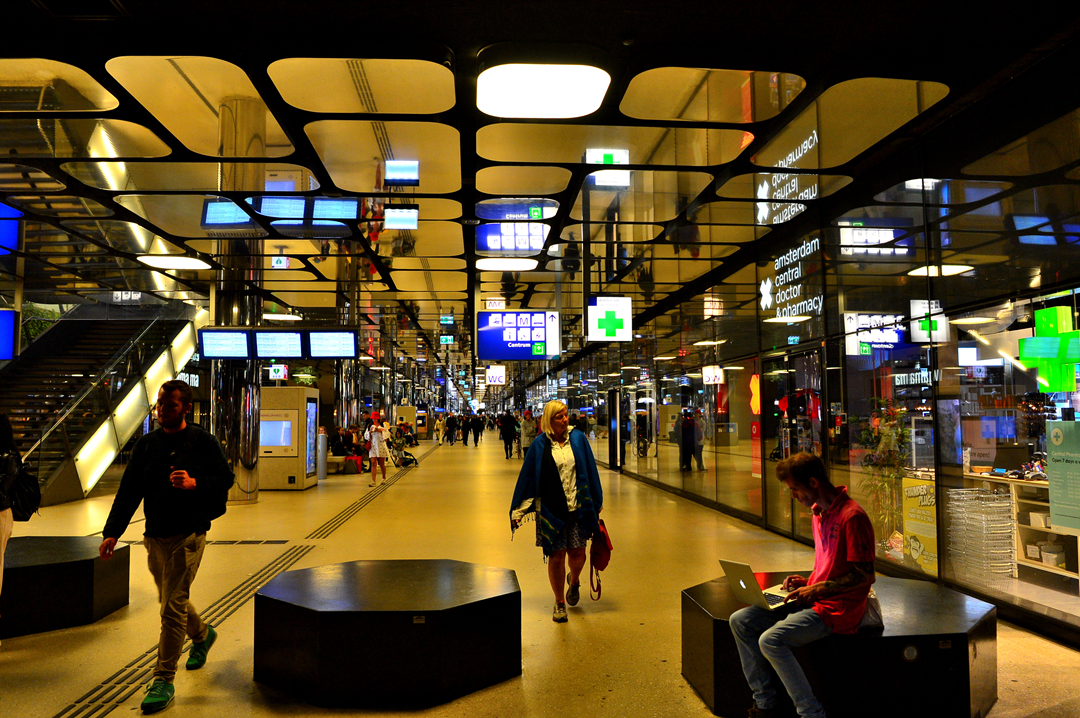 통로를 포함하고 있는 암스테르담 중앙역 모습이고~