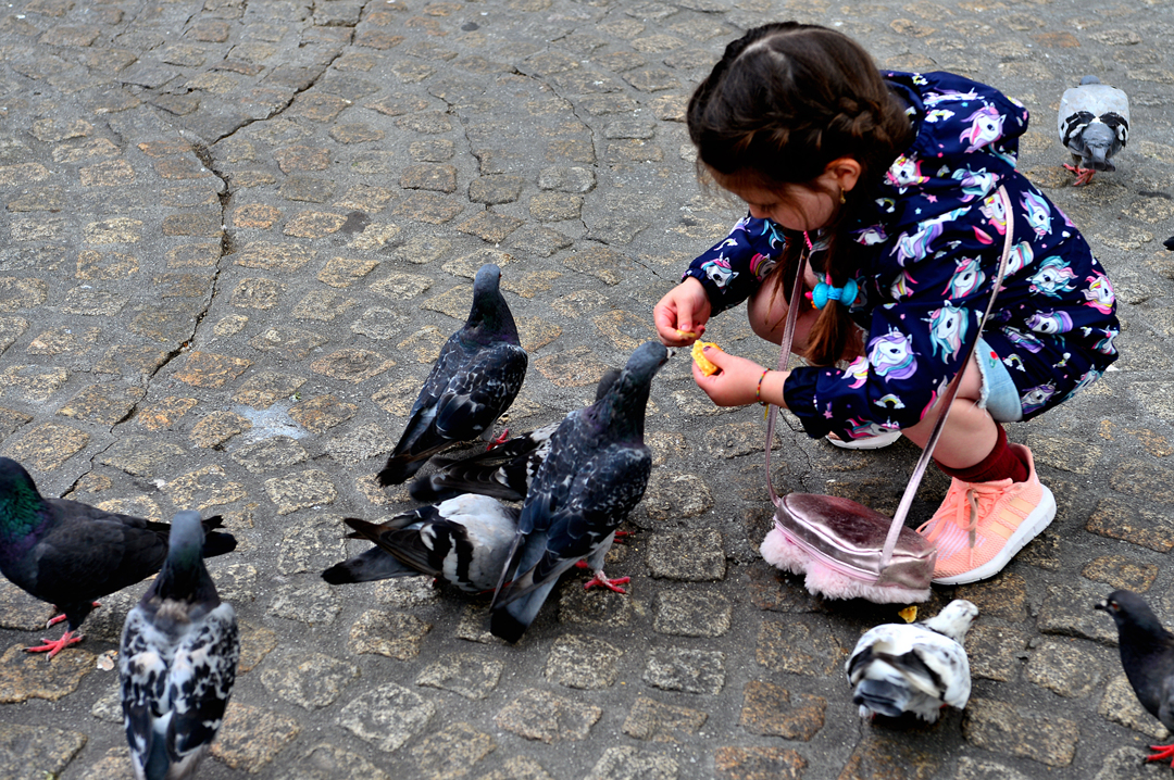 광장의 비둘기들과 놀고 있는 천진난만한 아이의 모습이 보기 좋다.