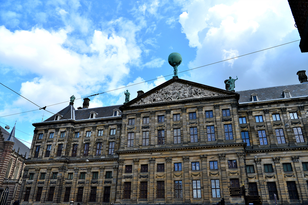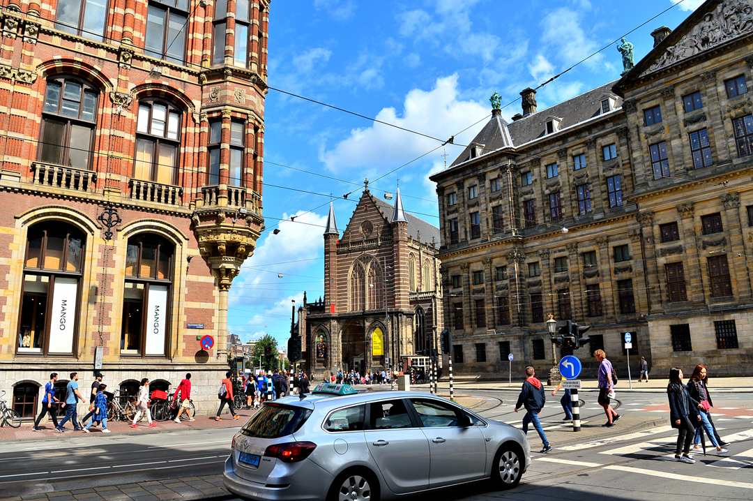 쇼핑몰 건너편 도로에서 본 신교회 De Nieuwe Kerk와 왕궁 모습이다.
