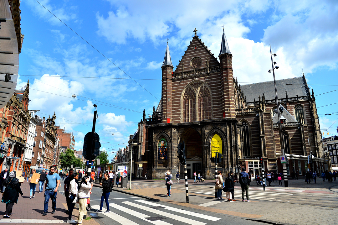 쇼핑몰 앞 도로 건너편의 신교회 De Nieuwe Kerk 모습이다.