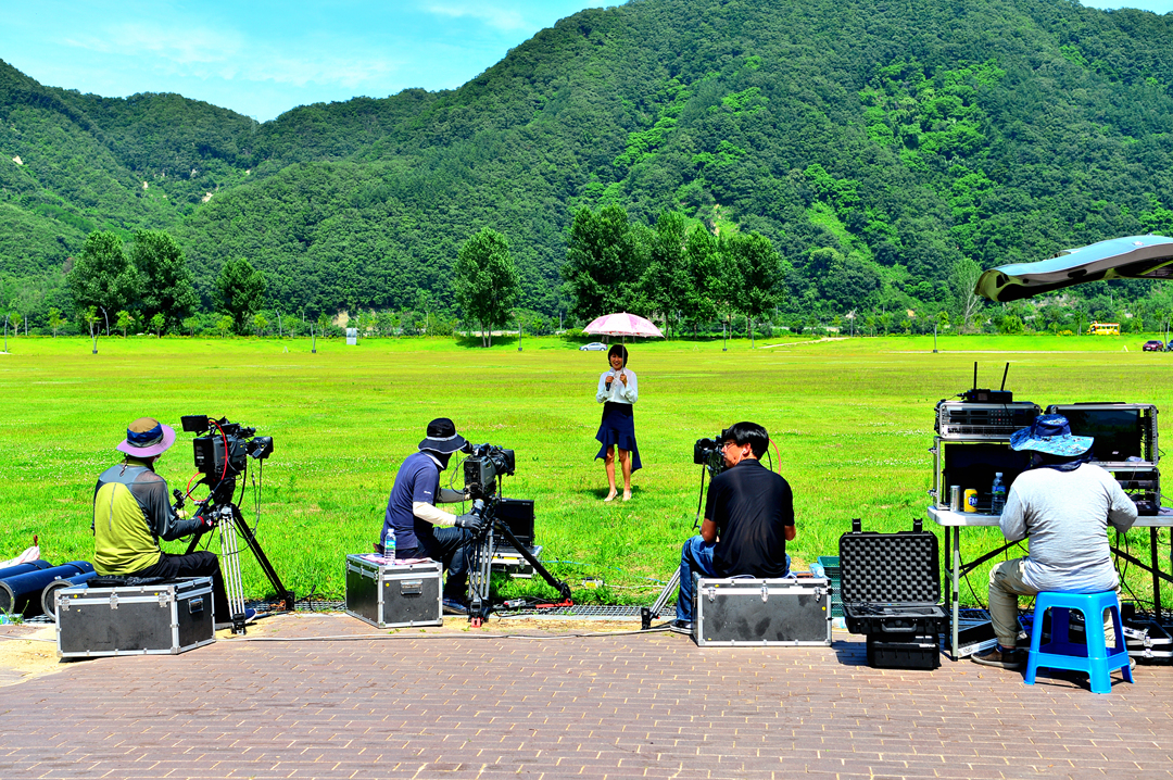푸른 잔디 광장을 배경으로 열심히 촬영을 하고 있는 모습이 보이는데, 흘러나오는 음악이 트롯이다.