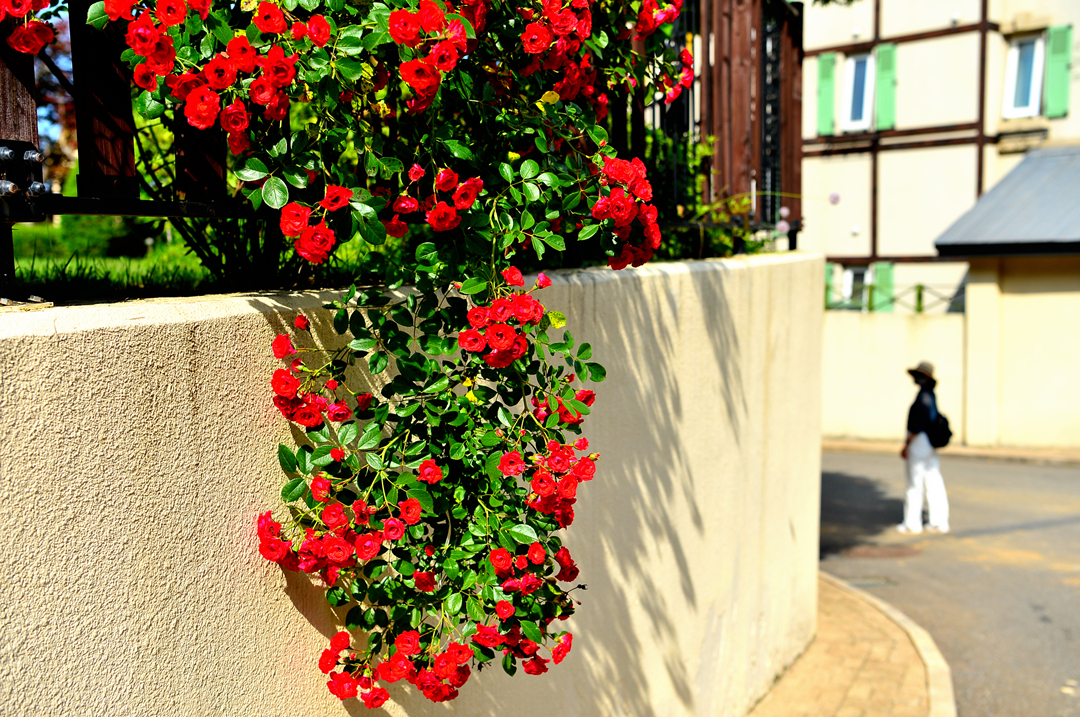 담장을 넘어온 덩굴장미가 아름답다.