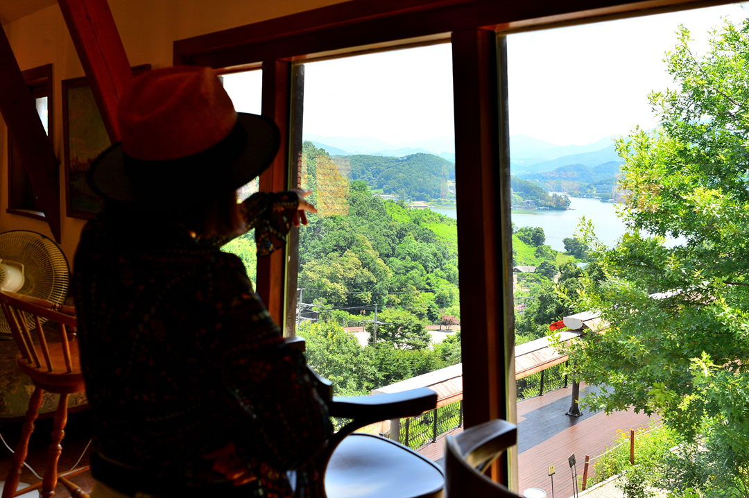 건물의 2층으로 먼저 올라가 봤는데, 청평 호반 모습이 시원스럽게 내려다 보인다.