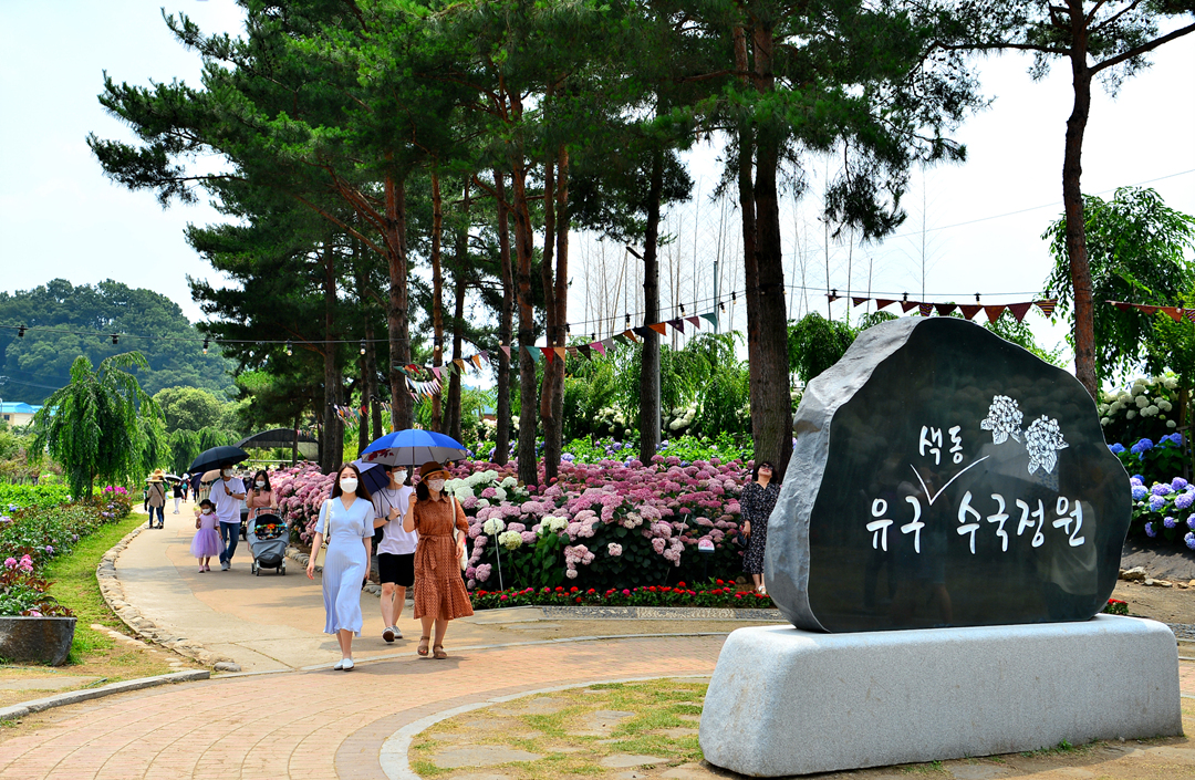이곳에는 유구 색동 수국 정원이라는 표지석이 세워져 있다.