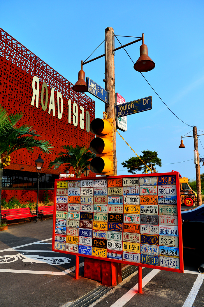 입구에 세워진 요란한 표지판과 각종 번호판들이 눈길을 끈다.