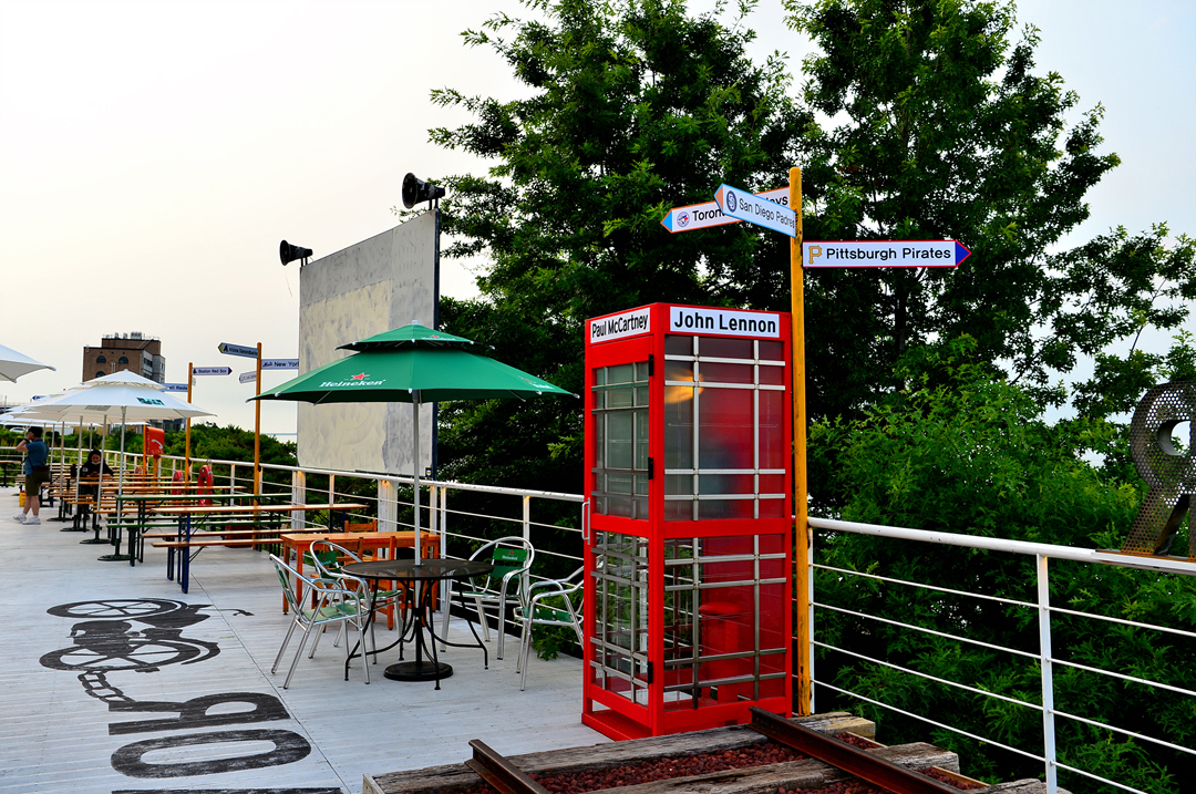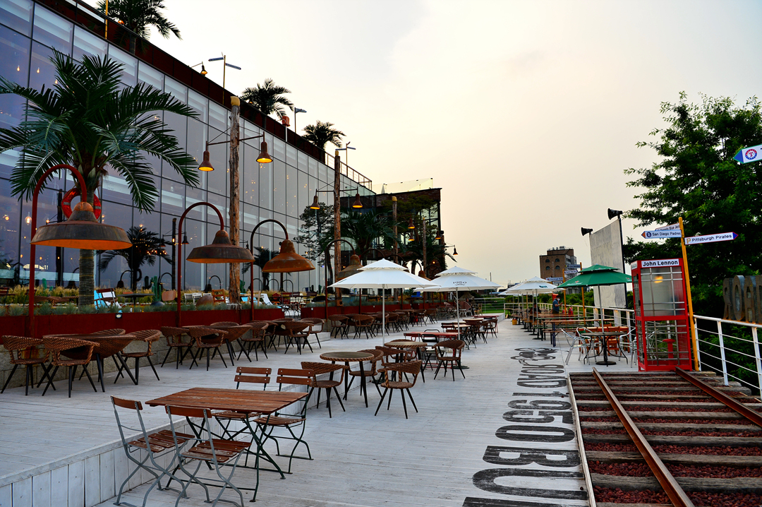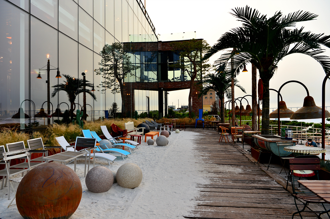 테이블 사이로 선베드도 놓여 있고 커다란 볼들도 놓아 다양한 모습을 연출하고 있다.