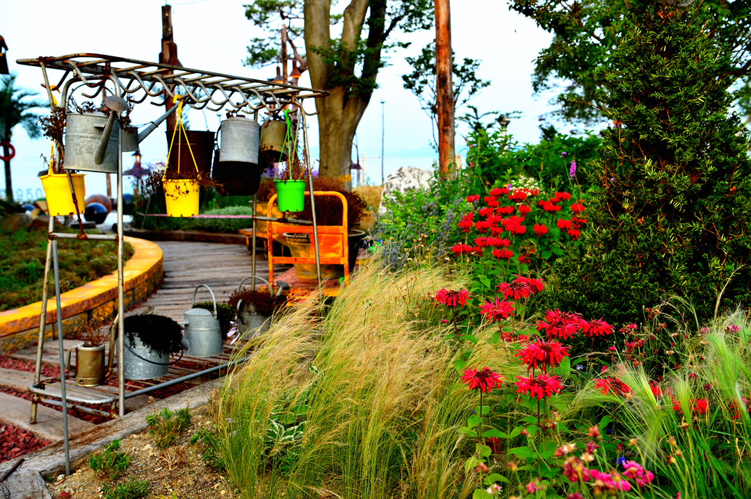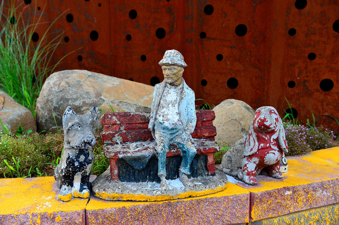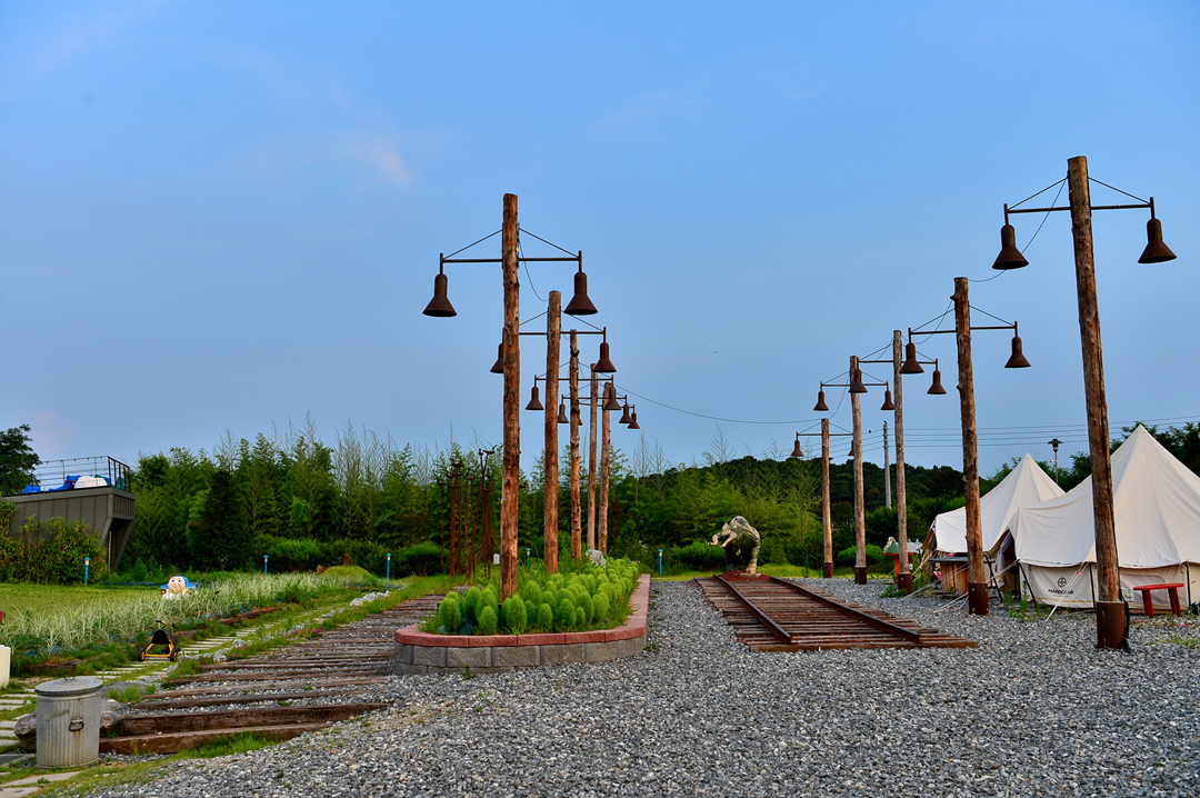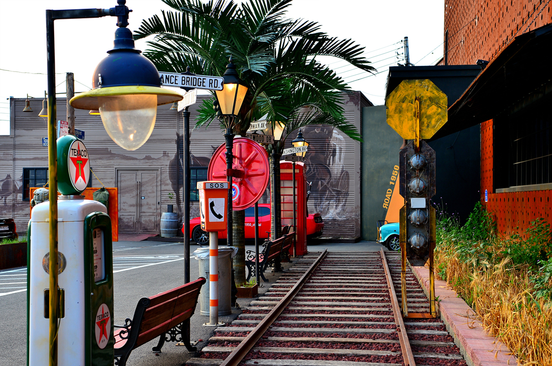 건물 전면에 깔아 놓은 레일과 소품들 모습이다.