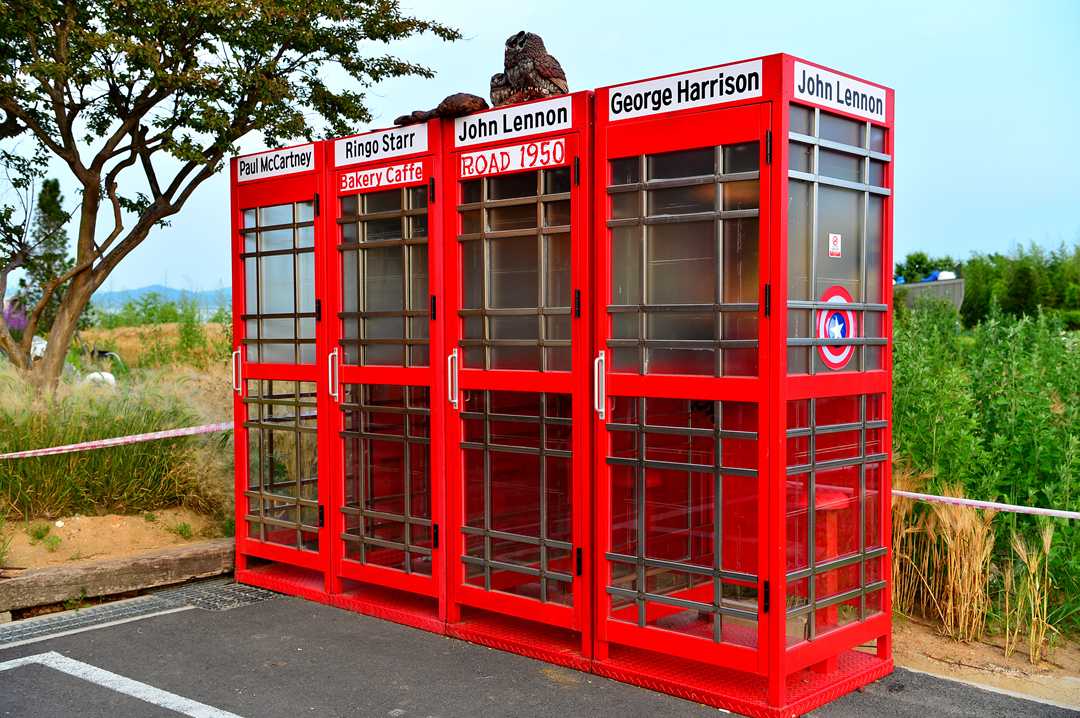 영국식 전화박스에는 영국 락스타 비틀즈 멤버의 이름을 적어 놓았다.