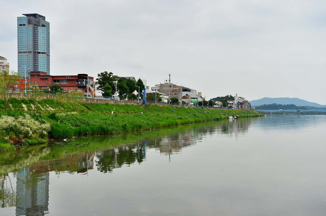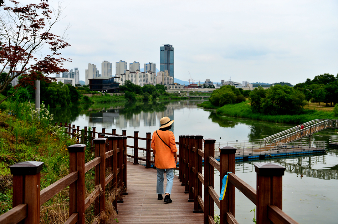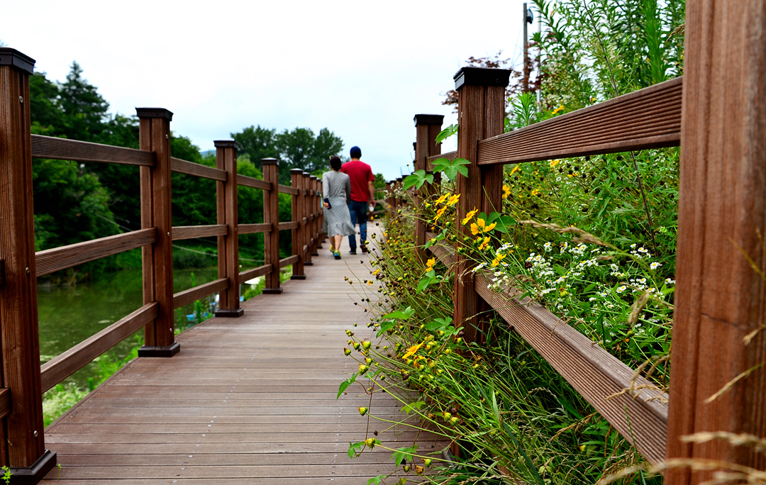 산책길 주변의 야생화와 강 건너편 풍경을 조망해 보며 산책을 즐긴다.