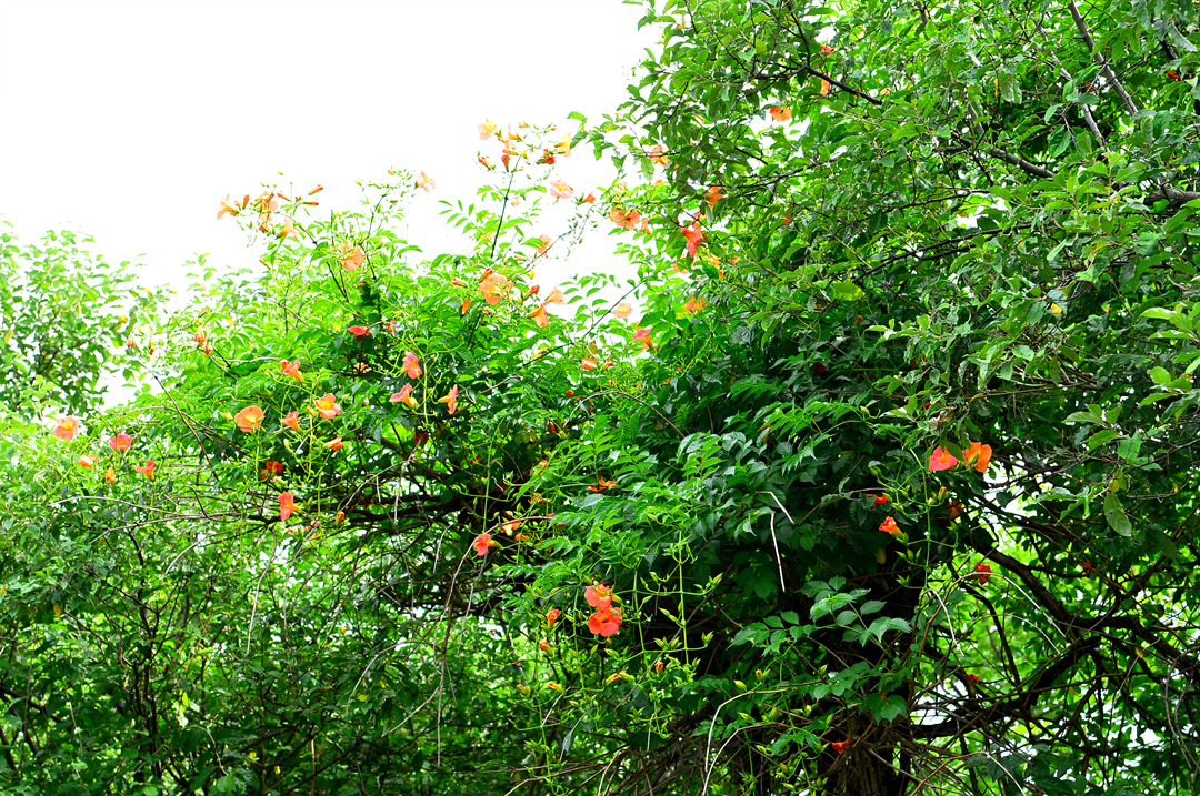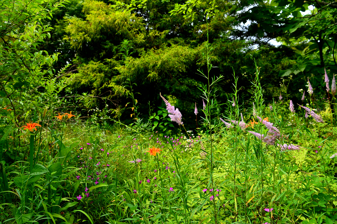 야트마한 언덕 위에는 각종 들꽃이 만발해 있고 숲 너머로는 양평 초입의 주택들이 보인다.