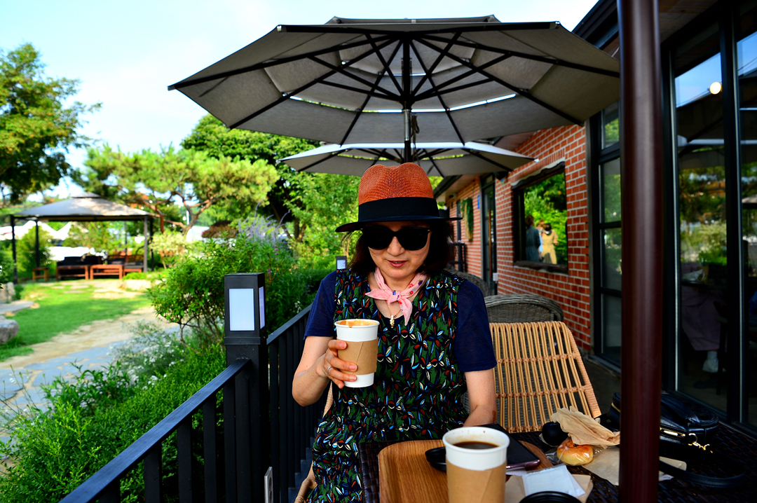 카페 건물 주변으로 다양한 형태의 야외 테이블을 배치해 놓고 있다.