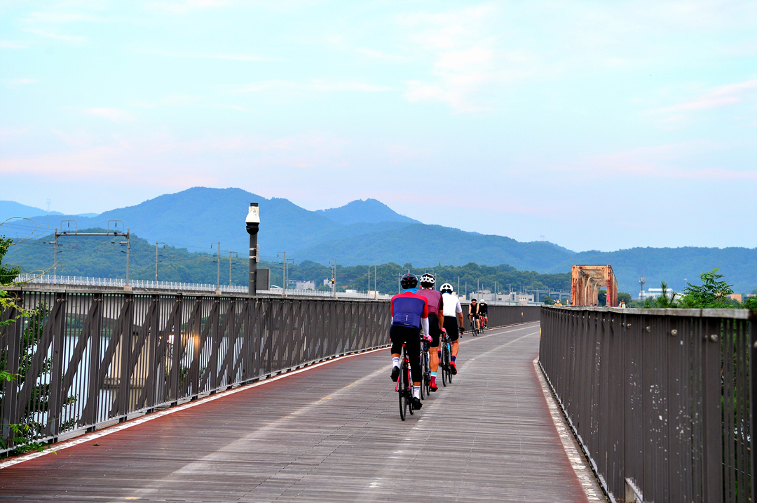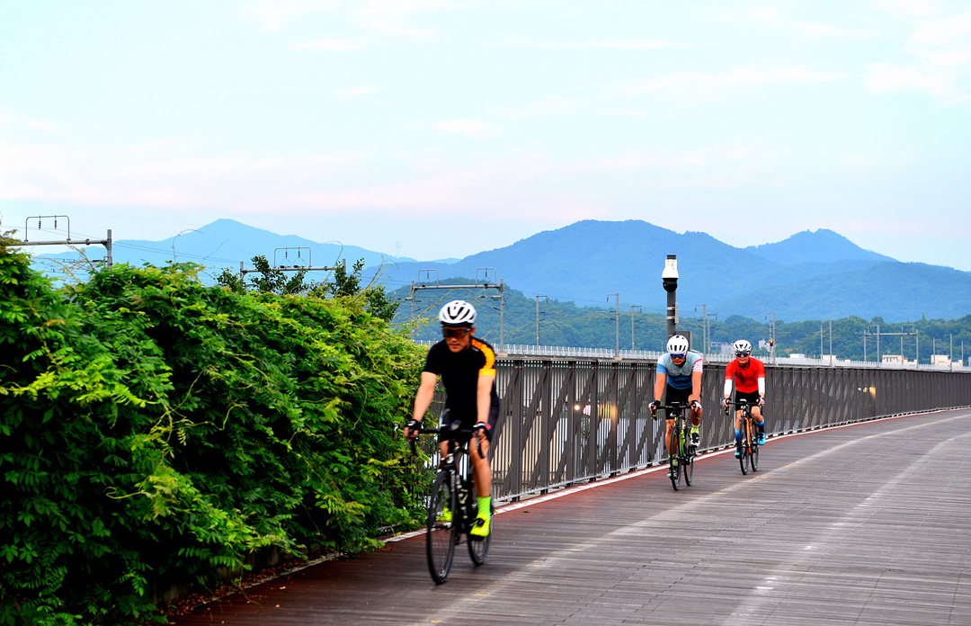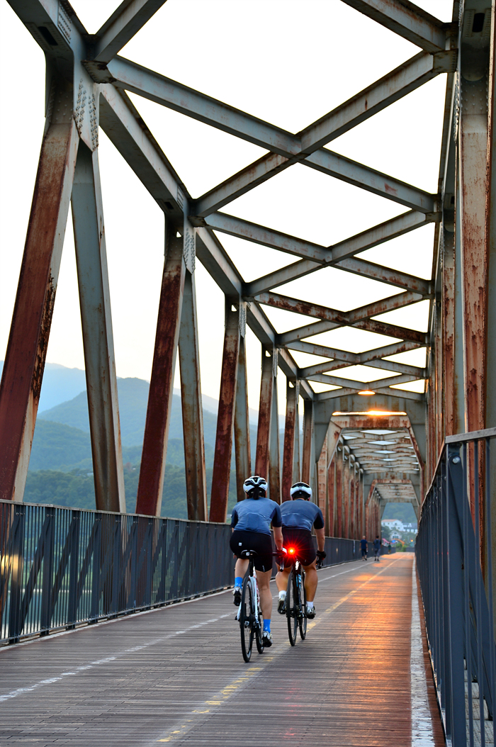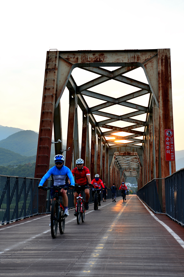 철길 위를 힘차게 달리는 라이더들 모습이다.