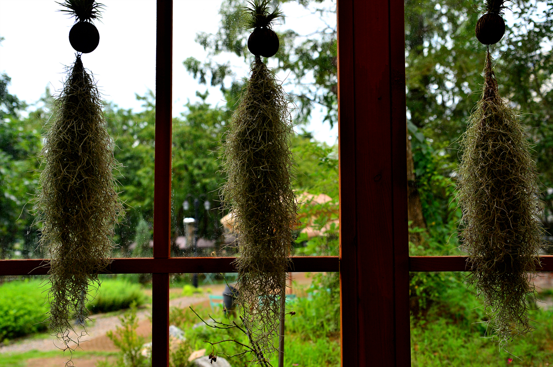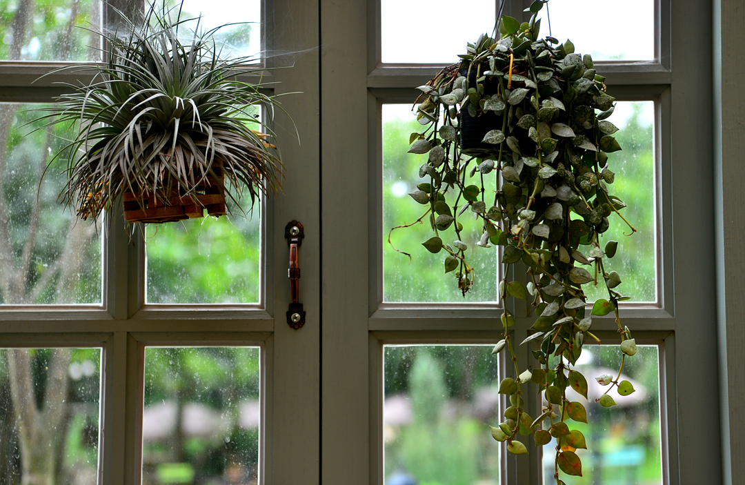 창문에 내걸어둔 식물들이 운치를 더해 준다.