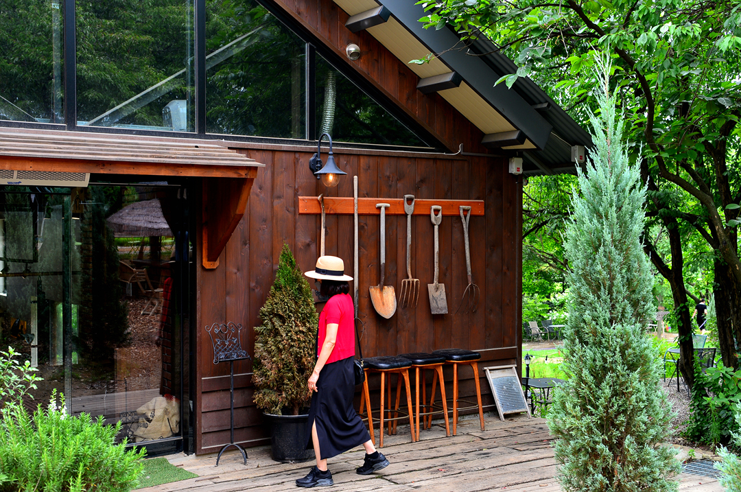 벽면에 농기구를 걸어놓은 이곳에 카페로 들어가는 입구가 있다.