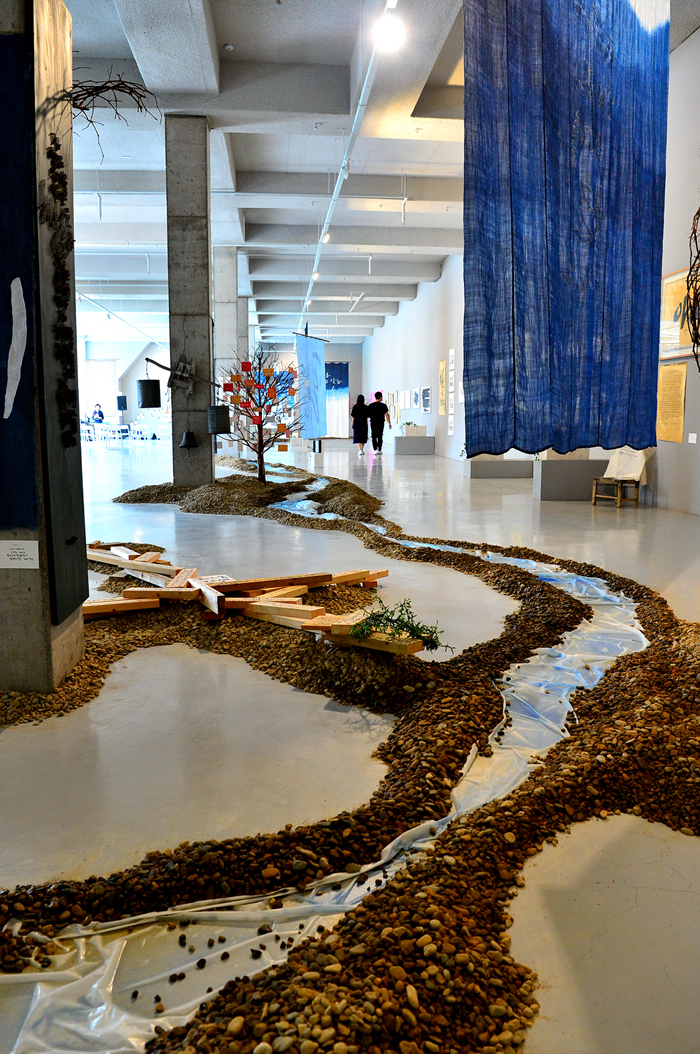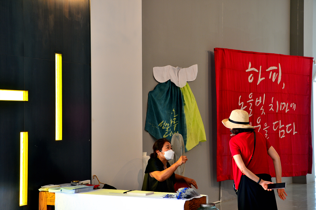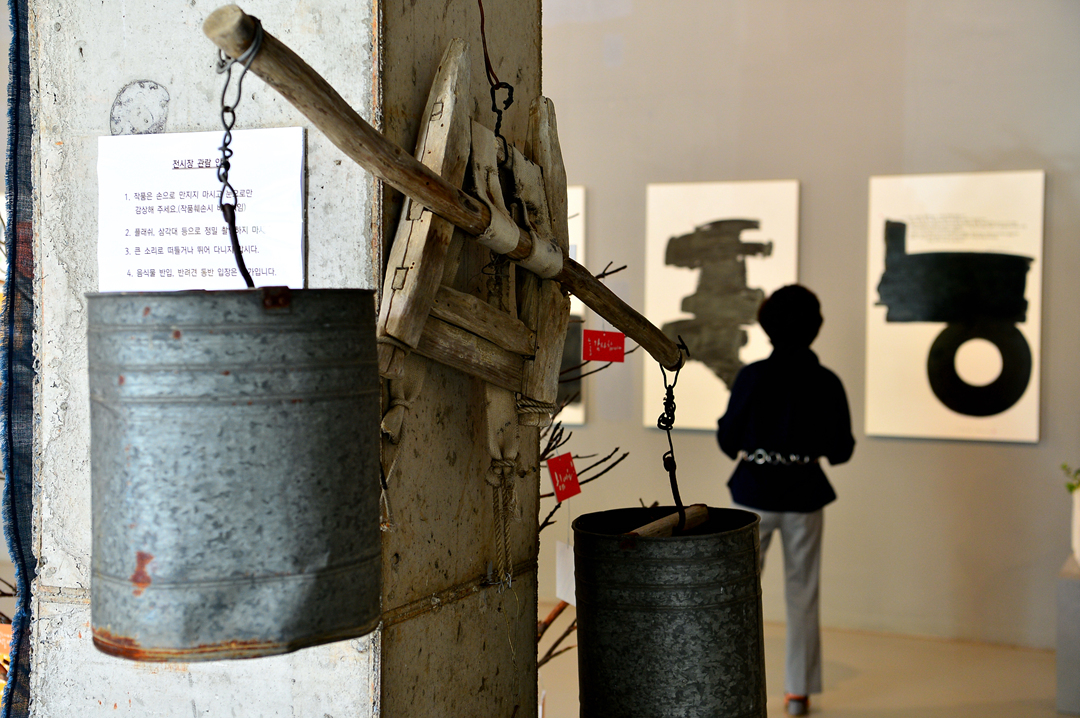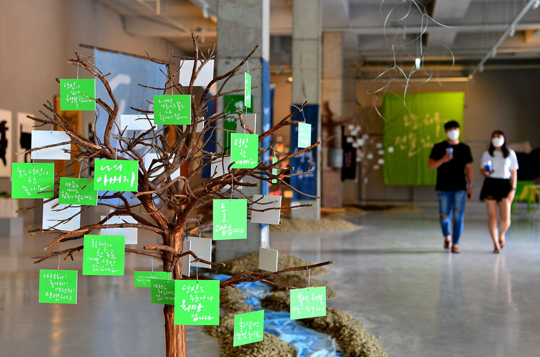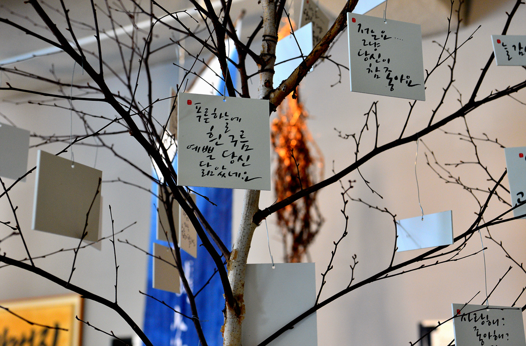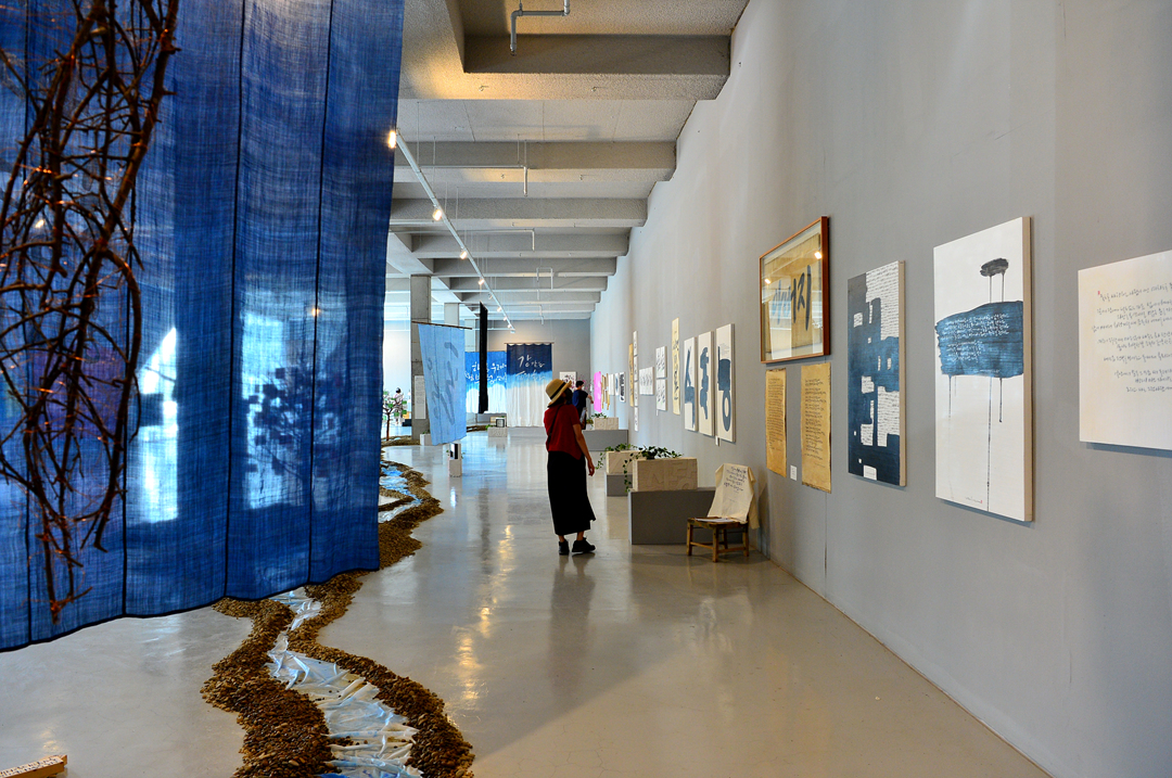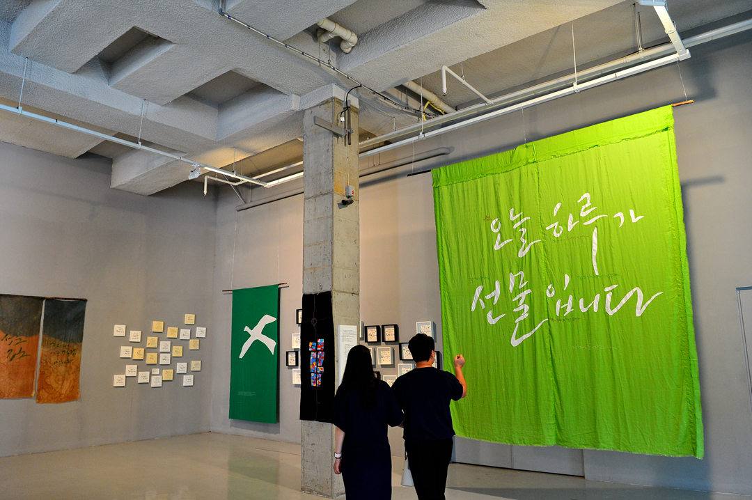 바닥 공간엔 자갈길과 물길을 만들고, 천장은 대형 천과 작은 모빌 작품으로 장식한다. 글씨 작품뿐만