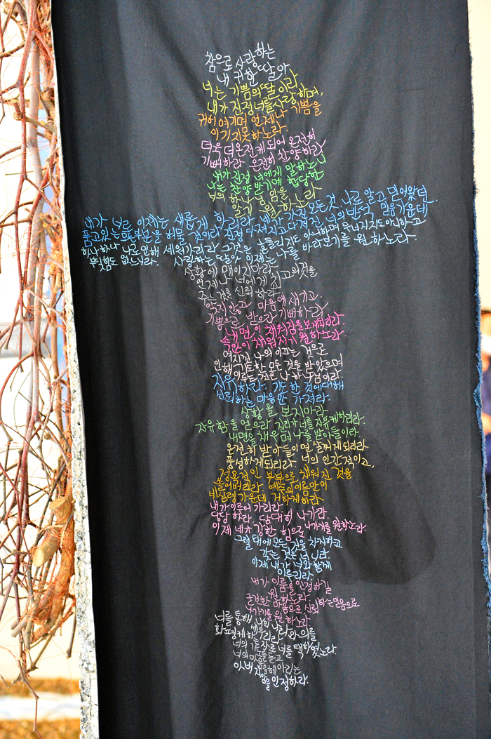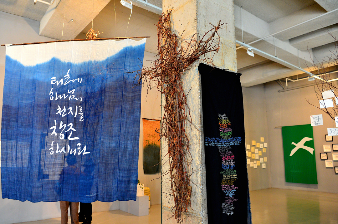 파란색 대형 천에 하얀 글씨로 바느질한 작품 ‘강 같은 평화’ ‘그대 있음에 내가 있네’ ‘그대여 아무 걱정 말아요’