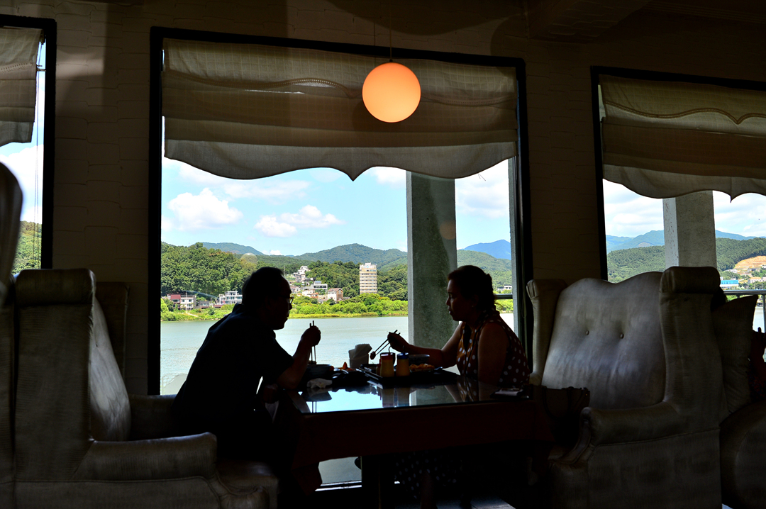 안으로 들어서니 창가 테이블 너머로 남한강이 훤히 바라다 보인다.