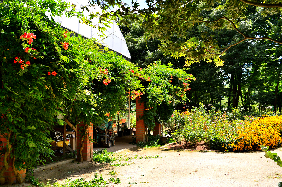 플라워 베드로 불리는 잘 가꾸어진 건물 밖 정원 모습이다.