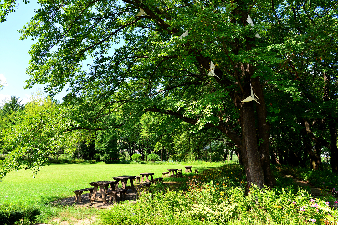 벚나무와 야외 테이블로 둘러싸인 잔디 광장 모습이다.
