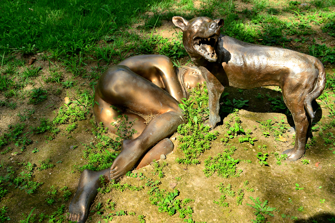 야외 공간에 설치되어 있는 듯한 조각품이 무척 이색적이다.