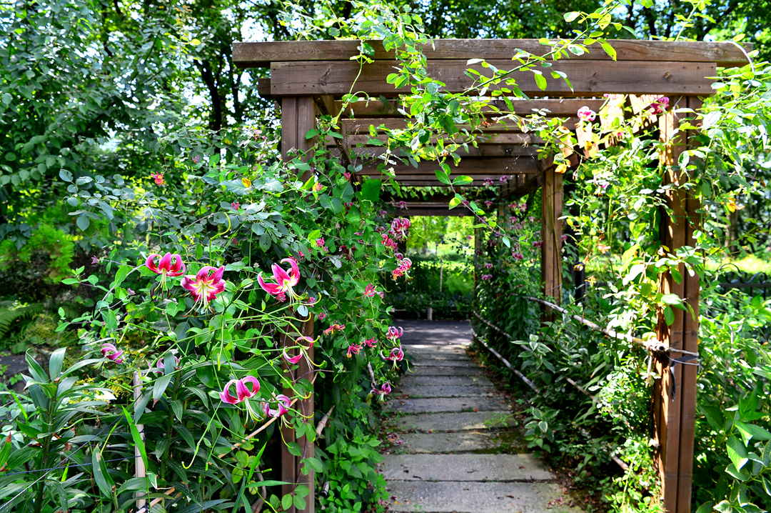 아름다운 꽃으로 장식된 멋진 파고라다.