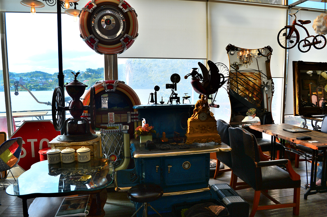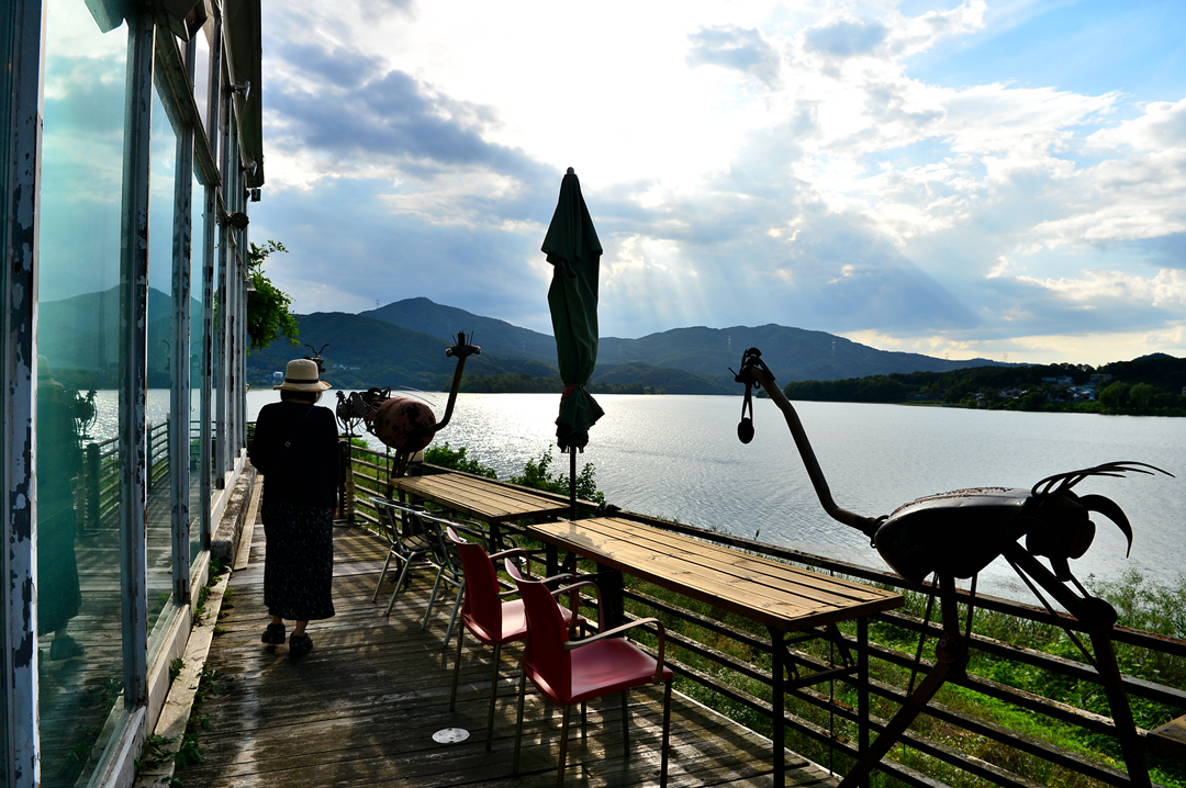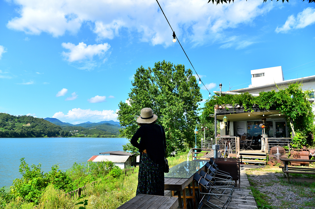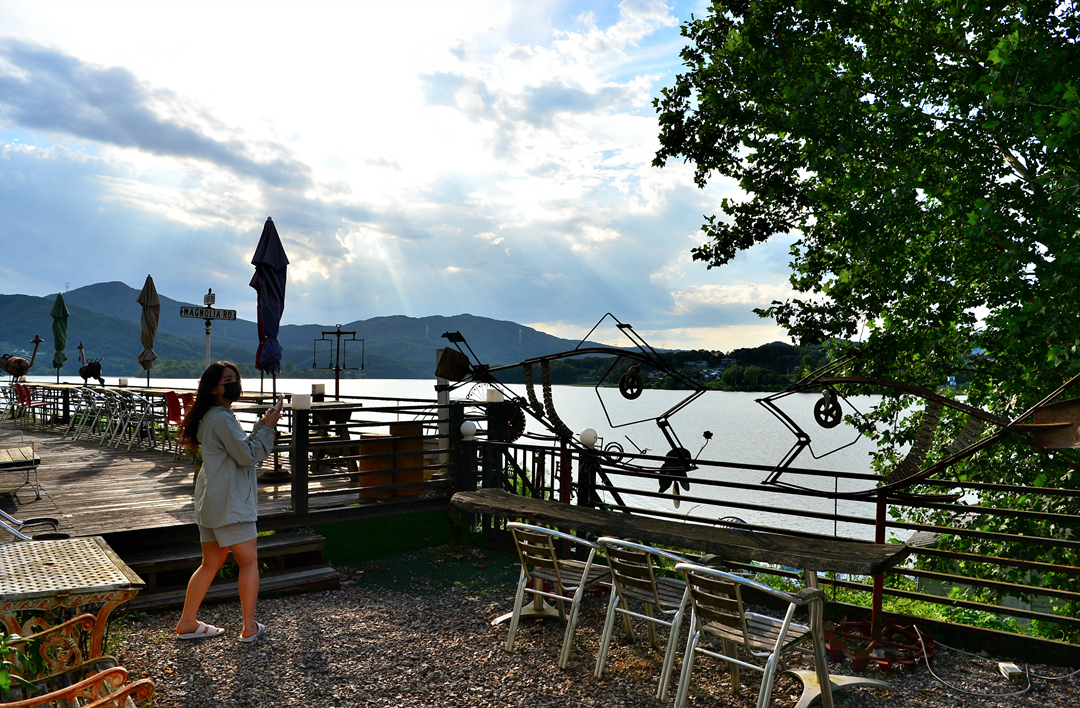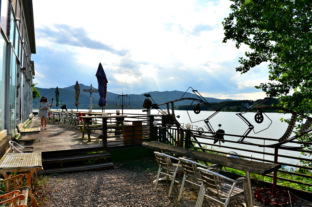 강을 조망해 볼 수 있는 테이블이 나란히 배치되어 있고 그 사이사이에는 각종