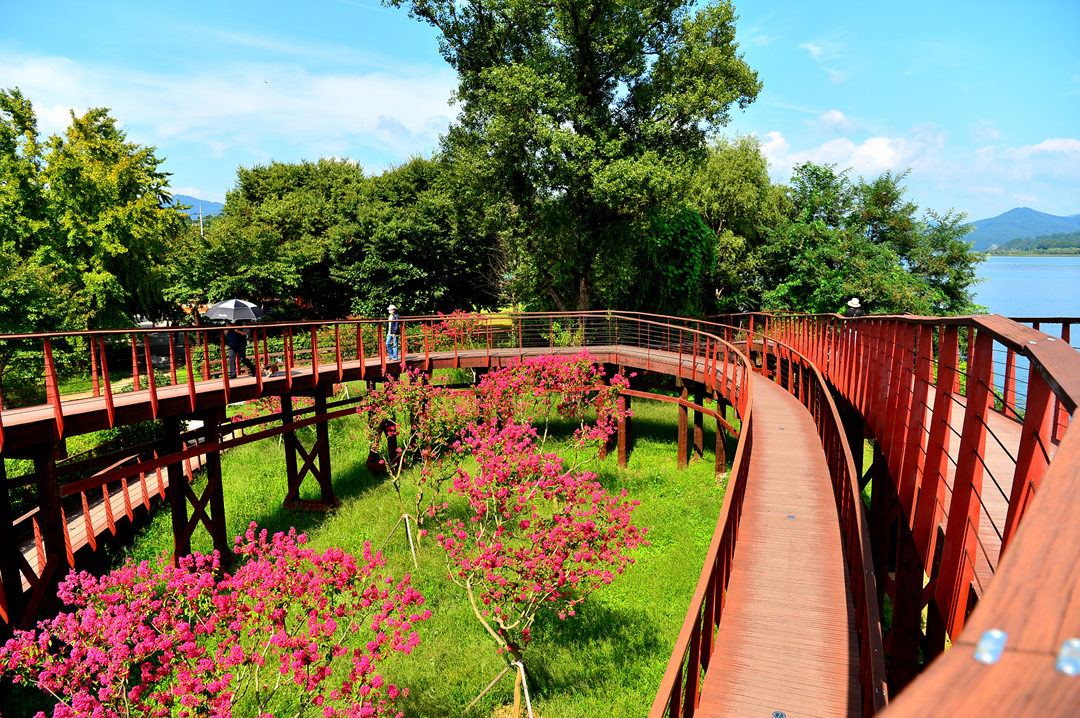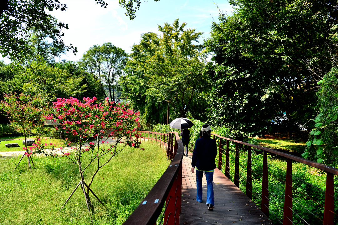 데크길 사이의 빨간 배롱나무 꽃이 인상적인 슬로프를 오른다.