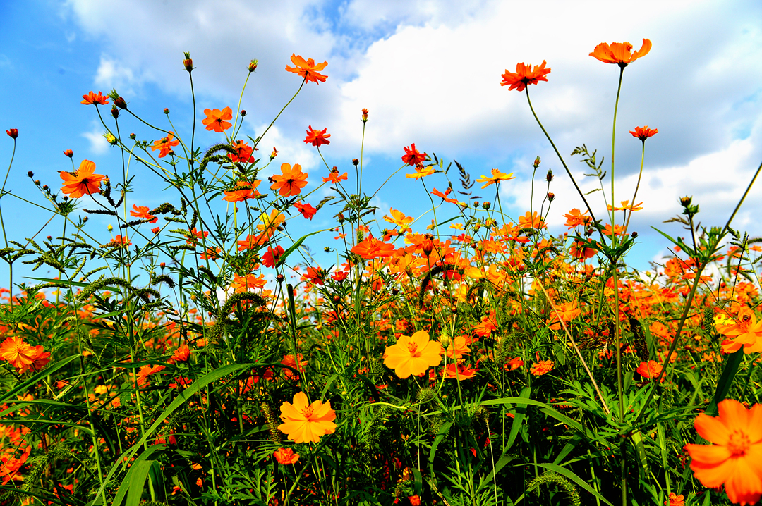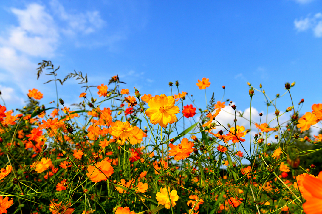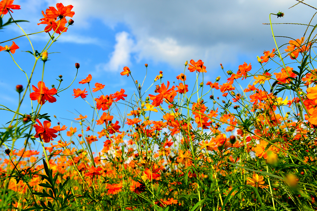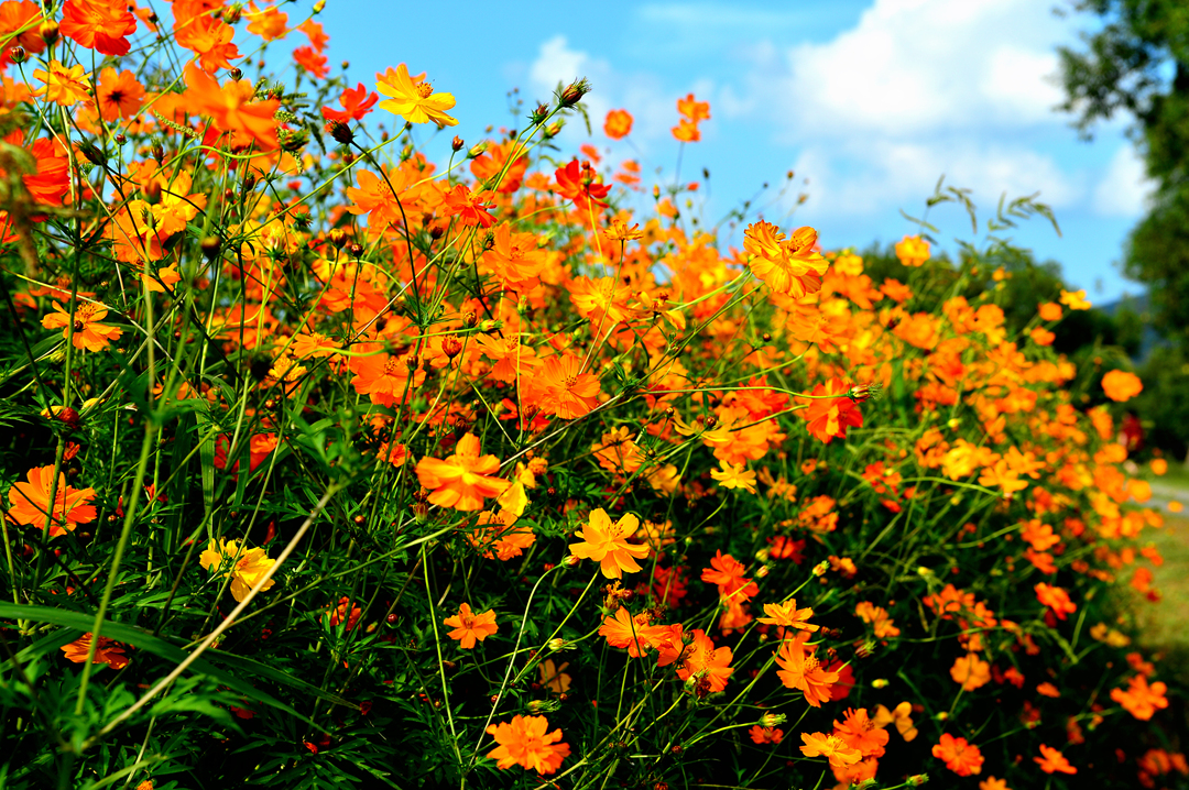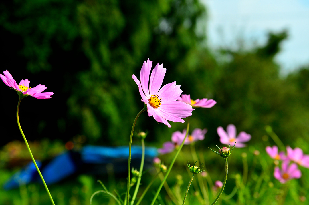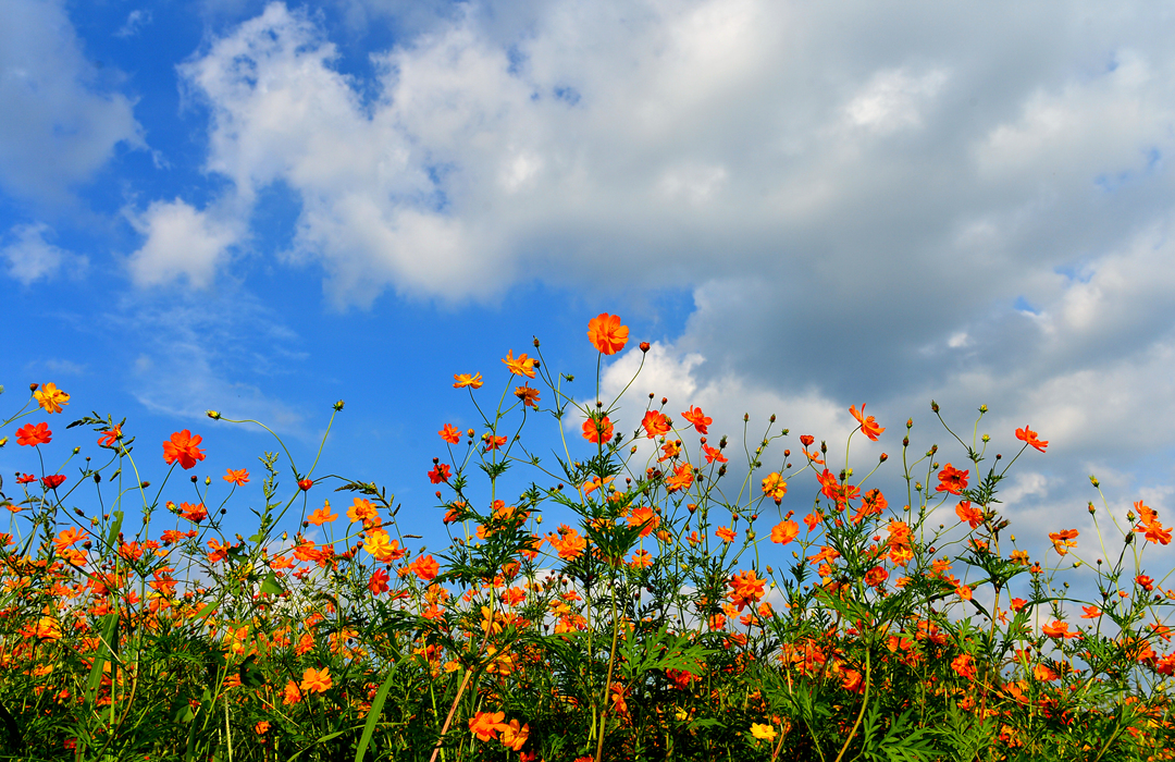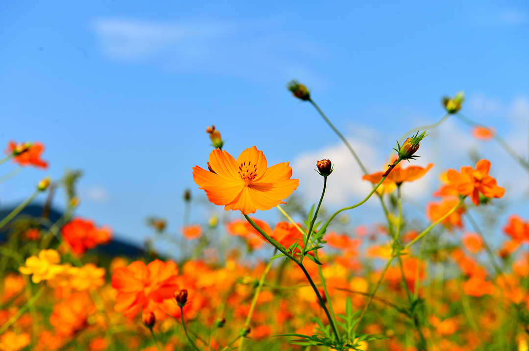 파아란 하늘에 대비되는 코스모스 색깔이 더욱 선명하고 아름답게 느껴진다.