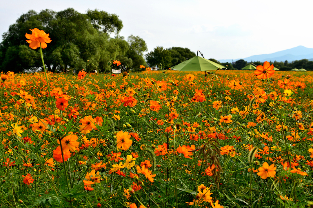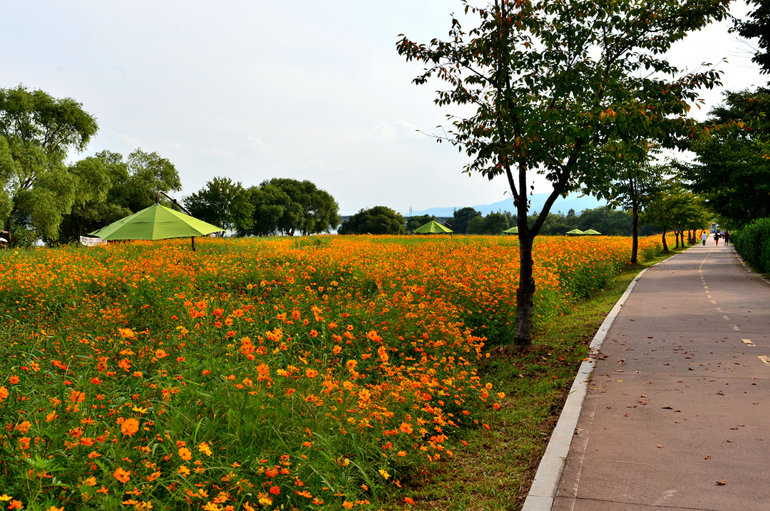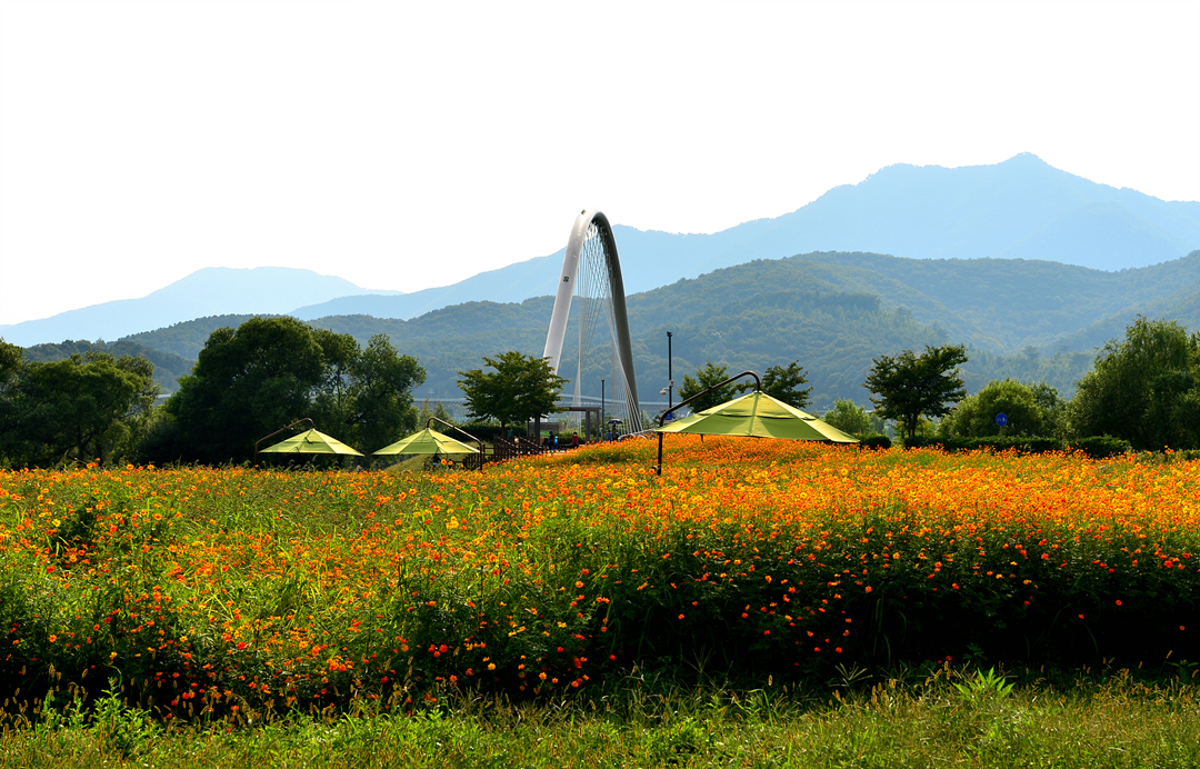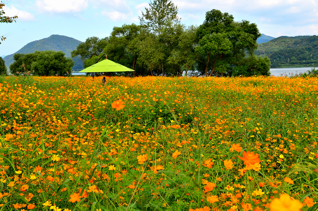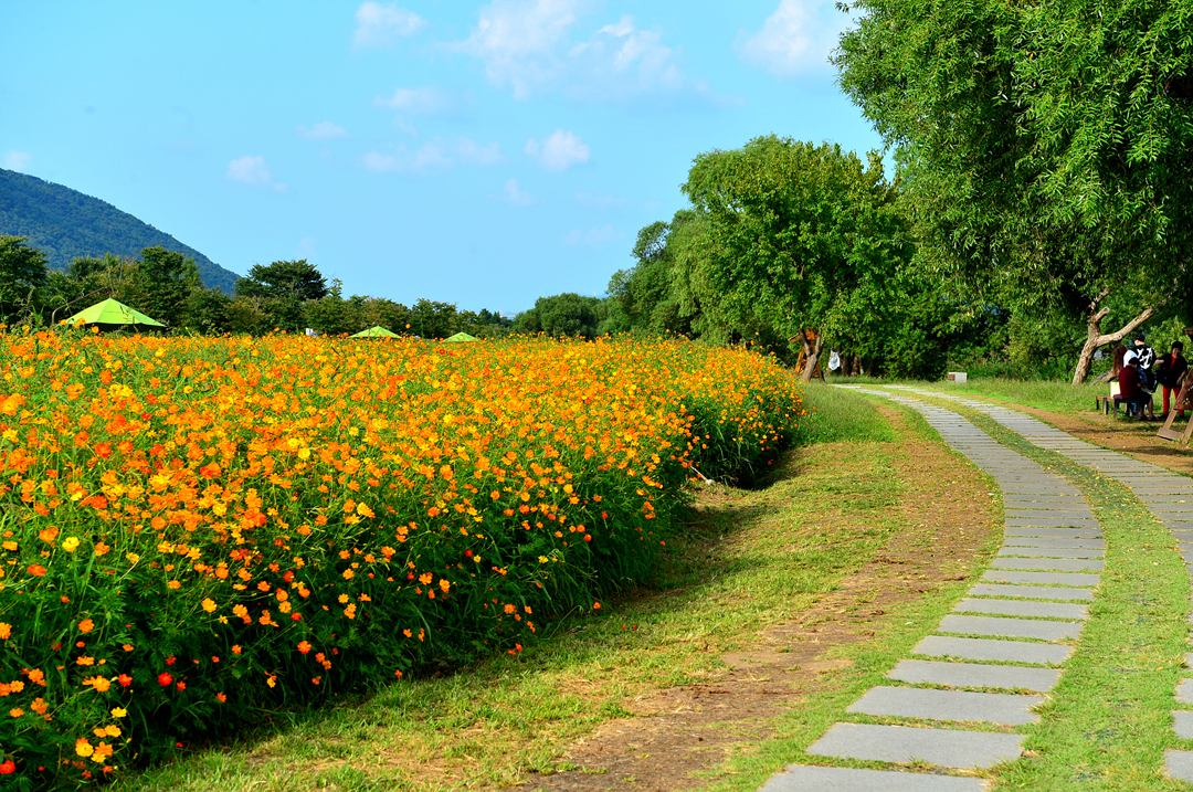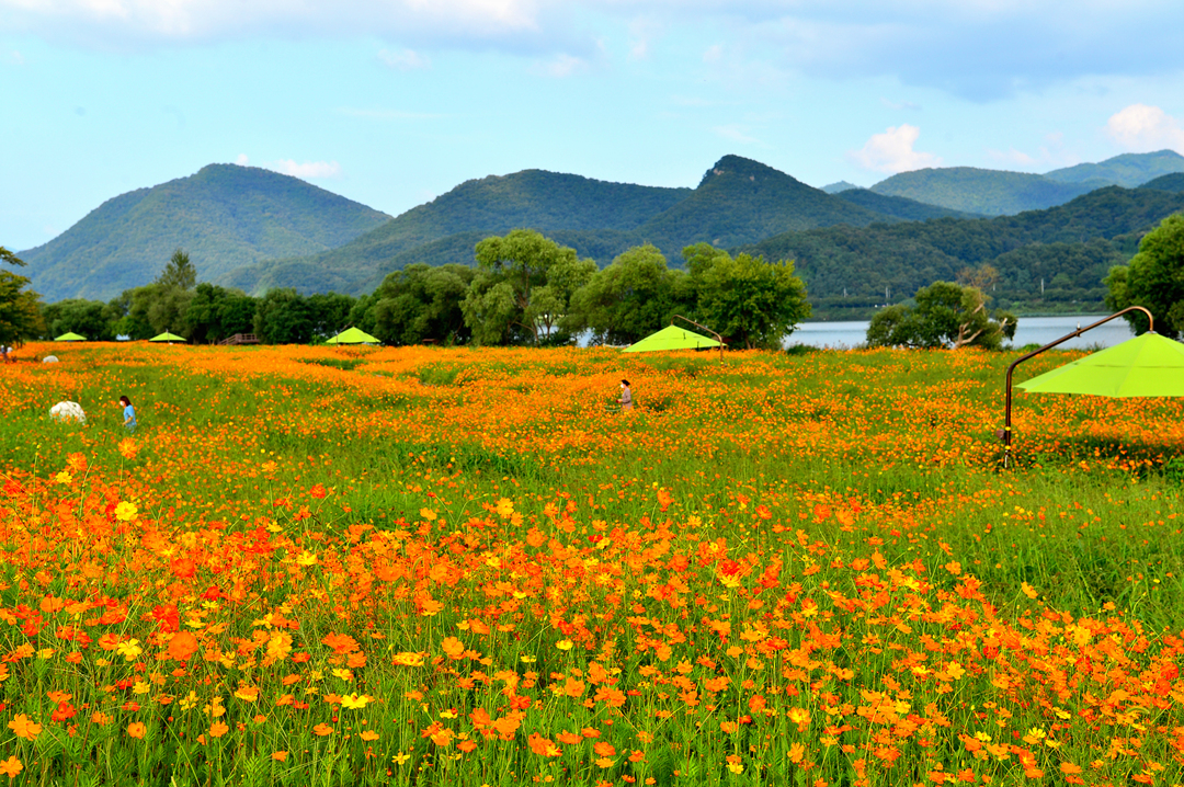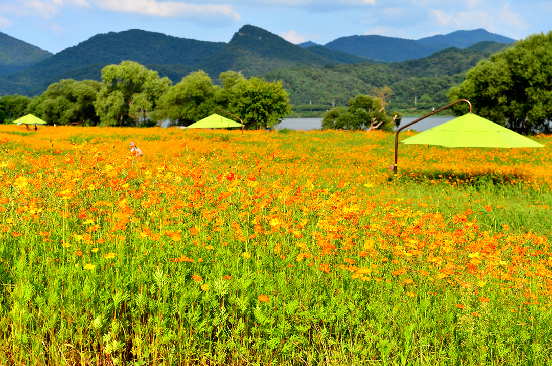 물의 정원을 가득 메운 황화코스모스 물결이다.
