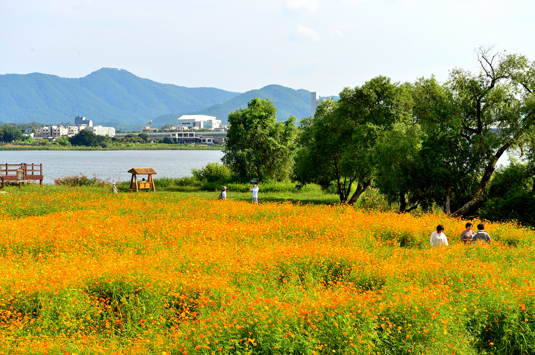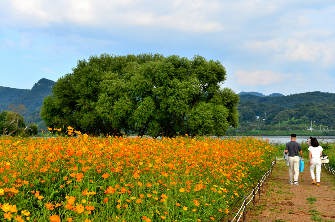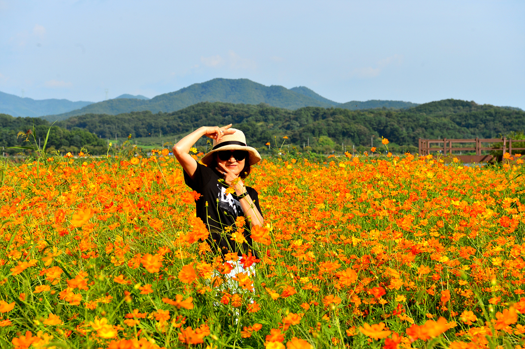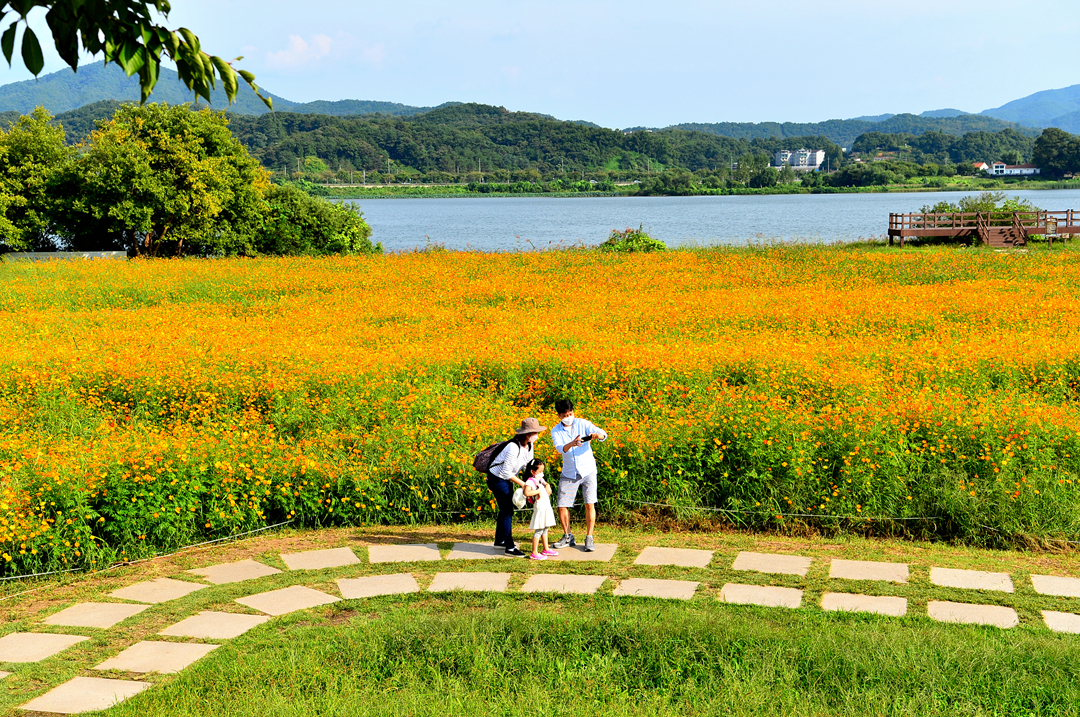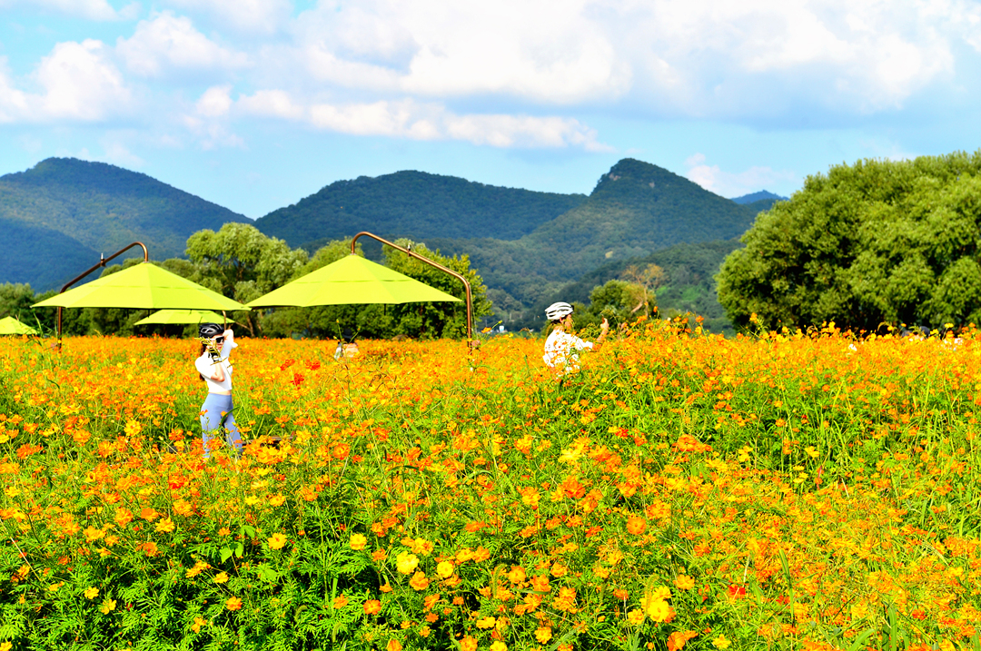 코스모스 꽃밭 곳곳에서 사람들 모습이 보이고