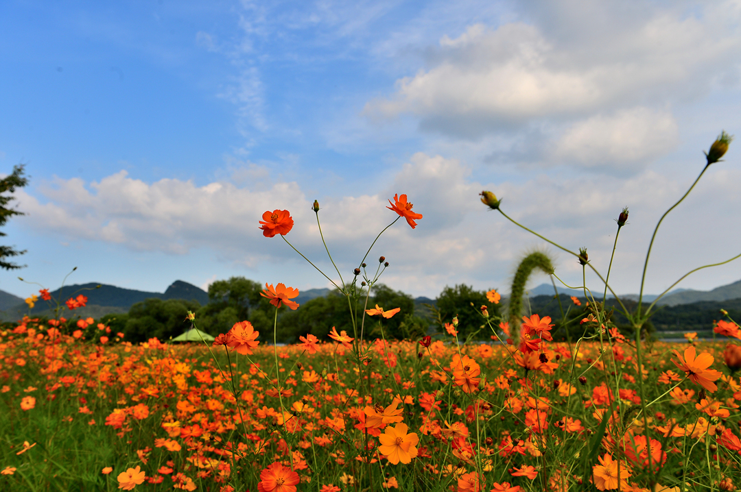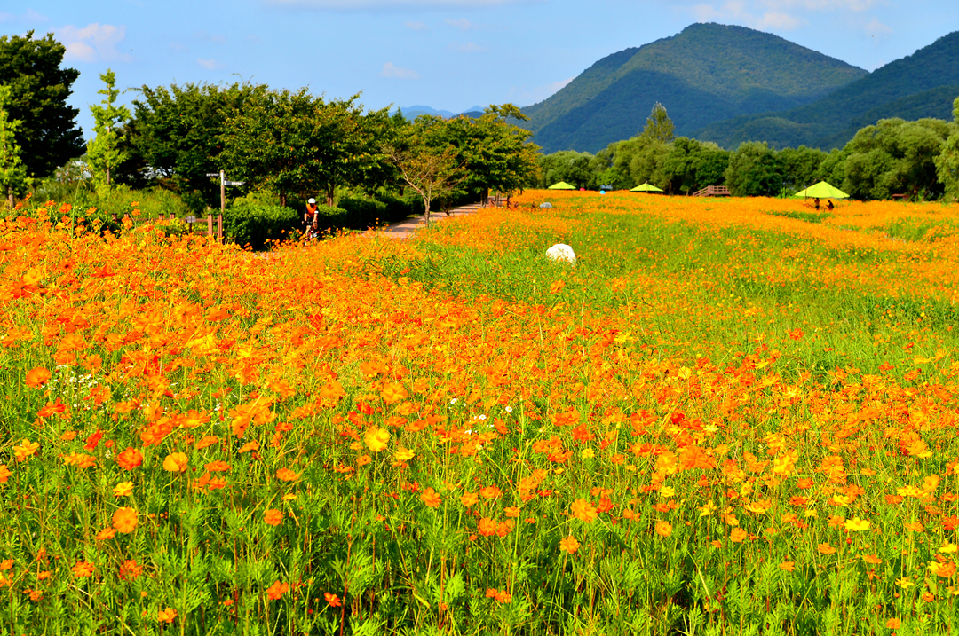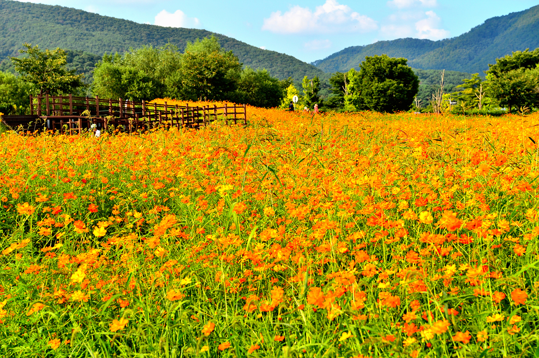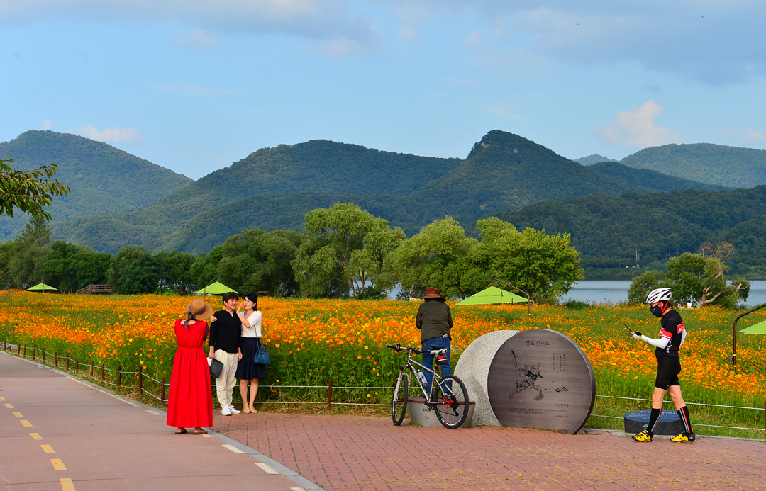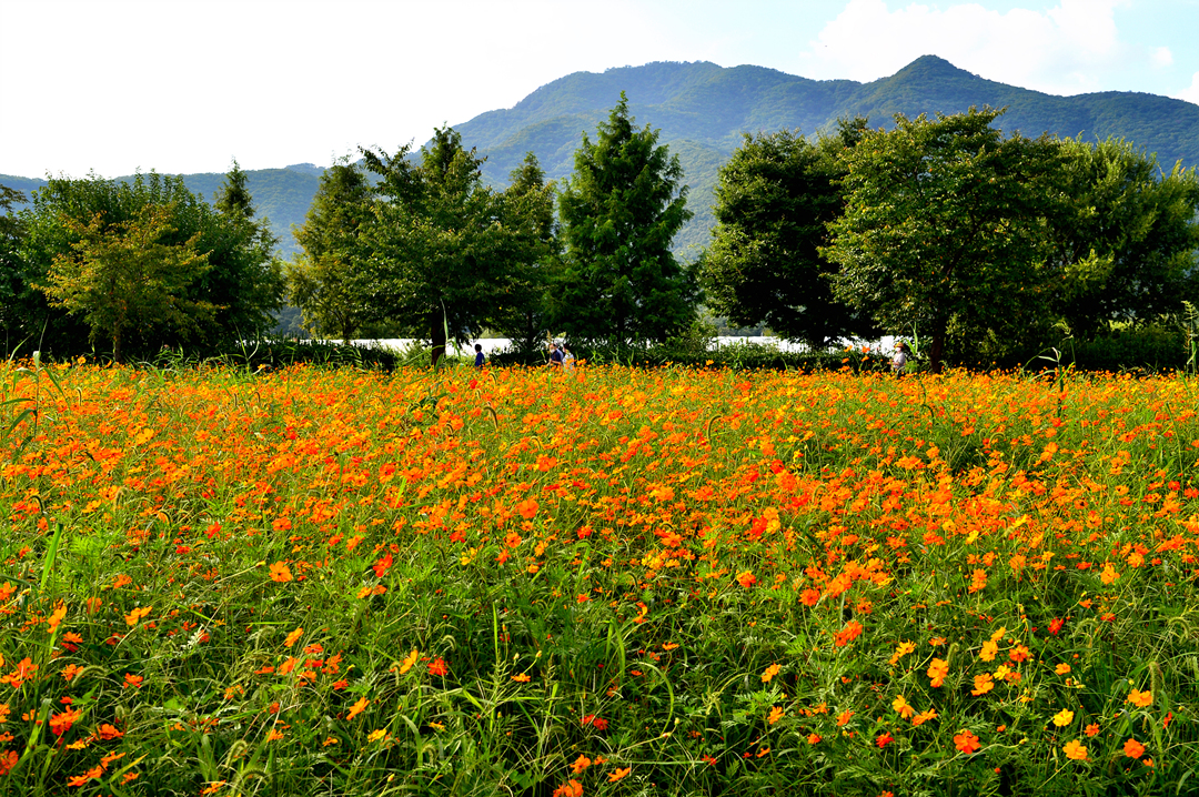코스모스 꽃밭 곳곳에서 사람들 모습이 보이고