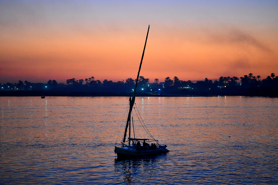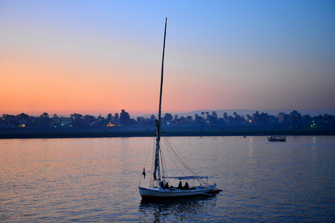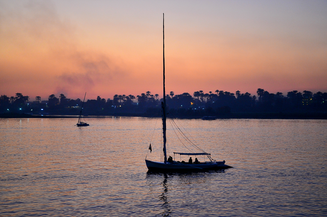 나일강의 오랜 전통을 지닌 돛단배 펠루카가 조용히 강 위를 흐르고 있다.