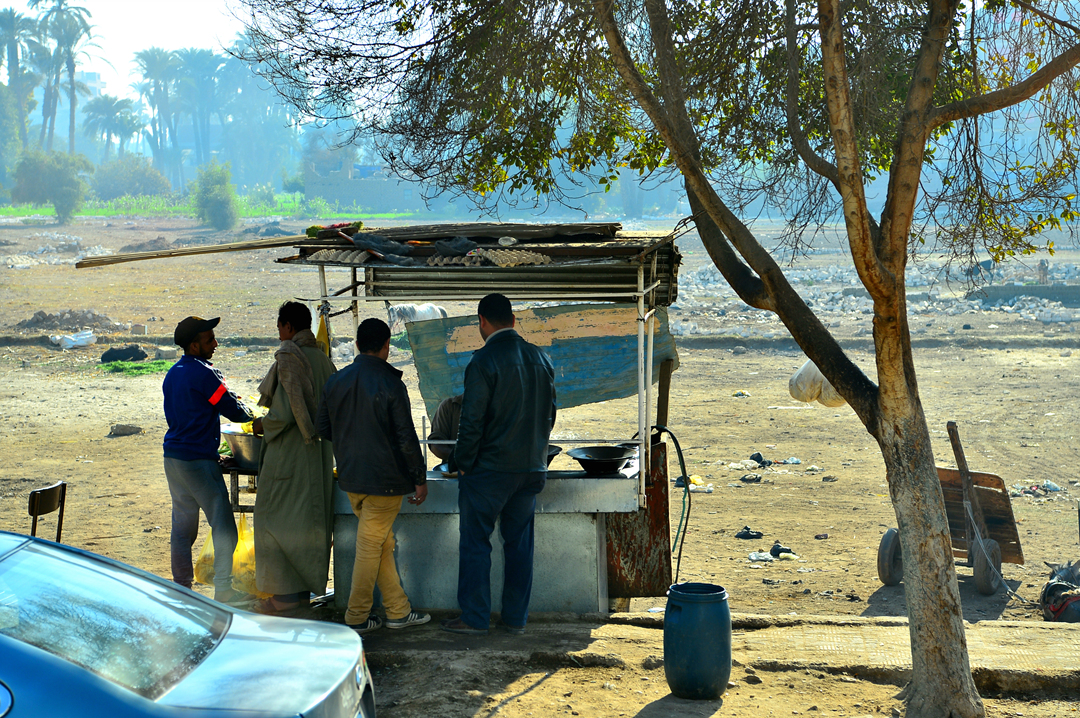 성인 몇 명이 서성거리는 곳에 조리 기구가 놓여 있는 걸 보니 뭔가를 조리해서 파는 곳 같은데