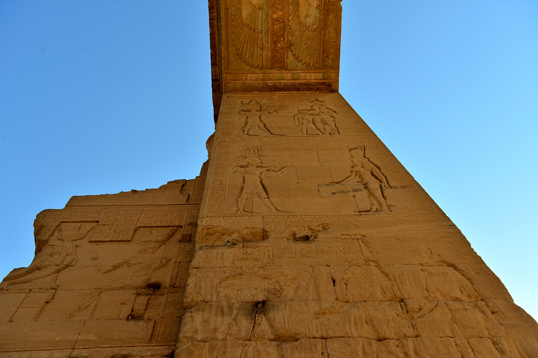 이 대신전 남쪽 바깥벽의 거대한 돋새김은 클레오파트라 7세와 그의 아들 카이사리온이