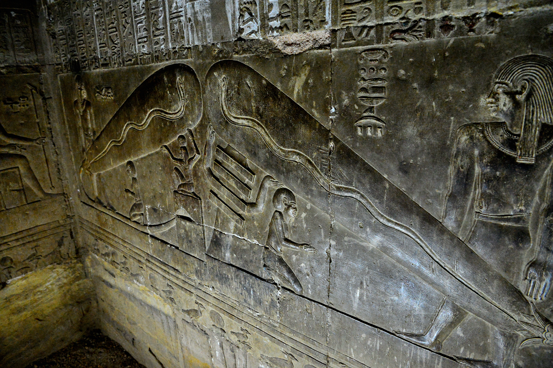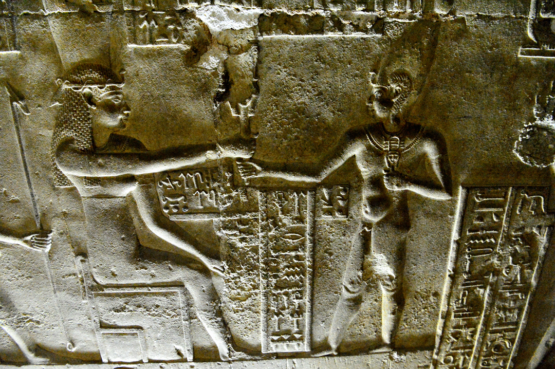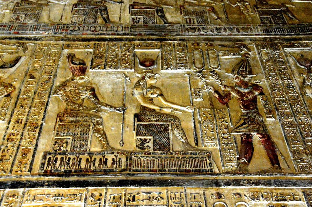 신과 파라오의 돋새김 아래에는 나일의 신 하피가 상하 이집트를 통합하는 의식을 나타내는 세마타위