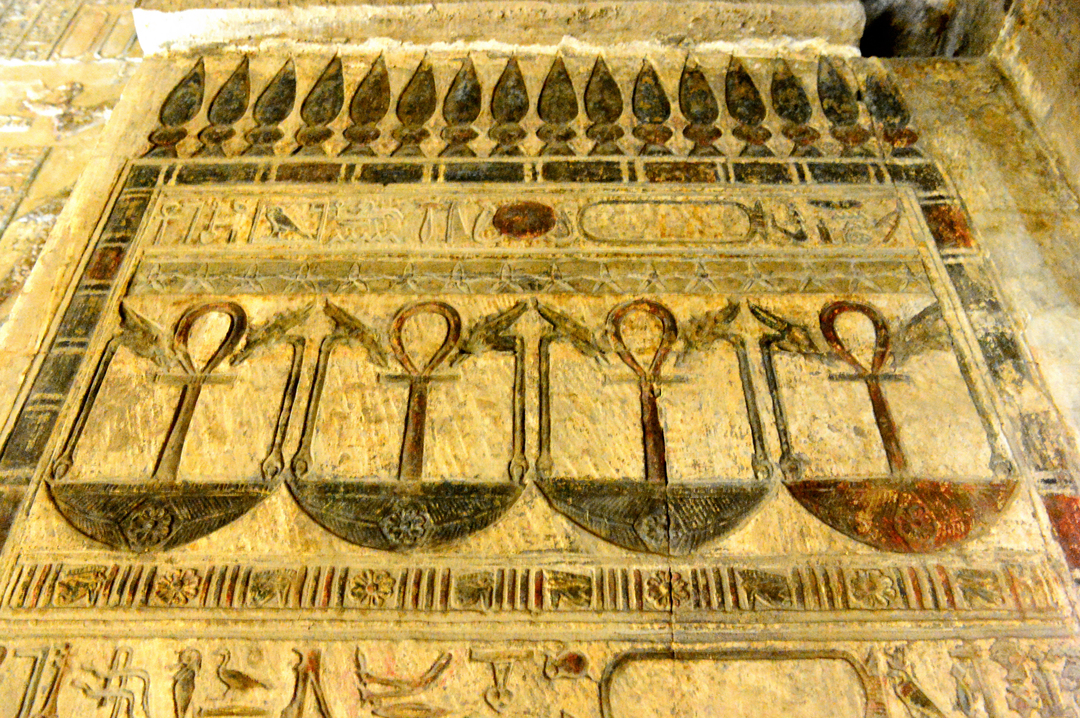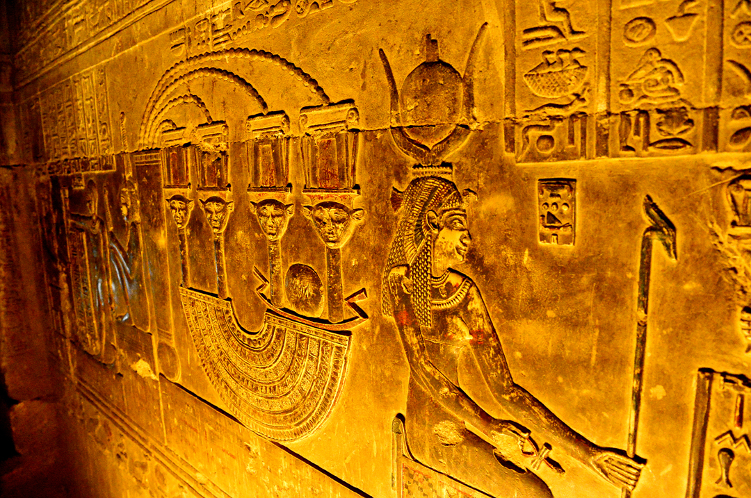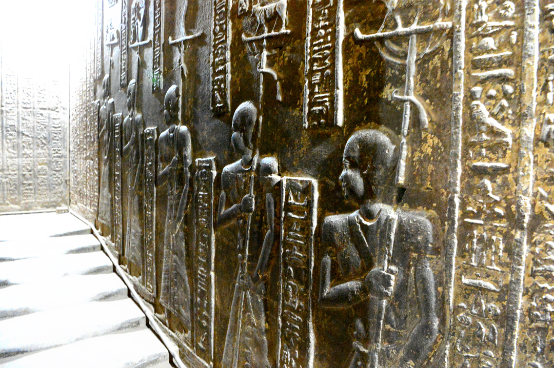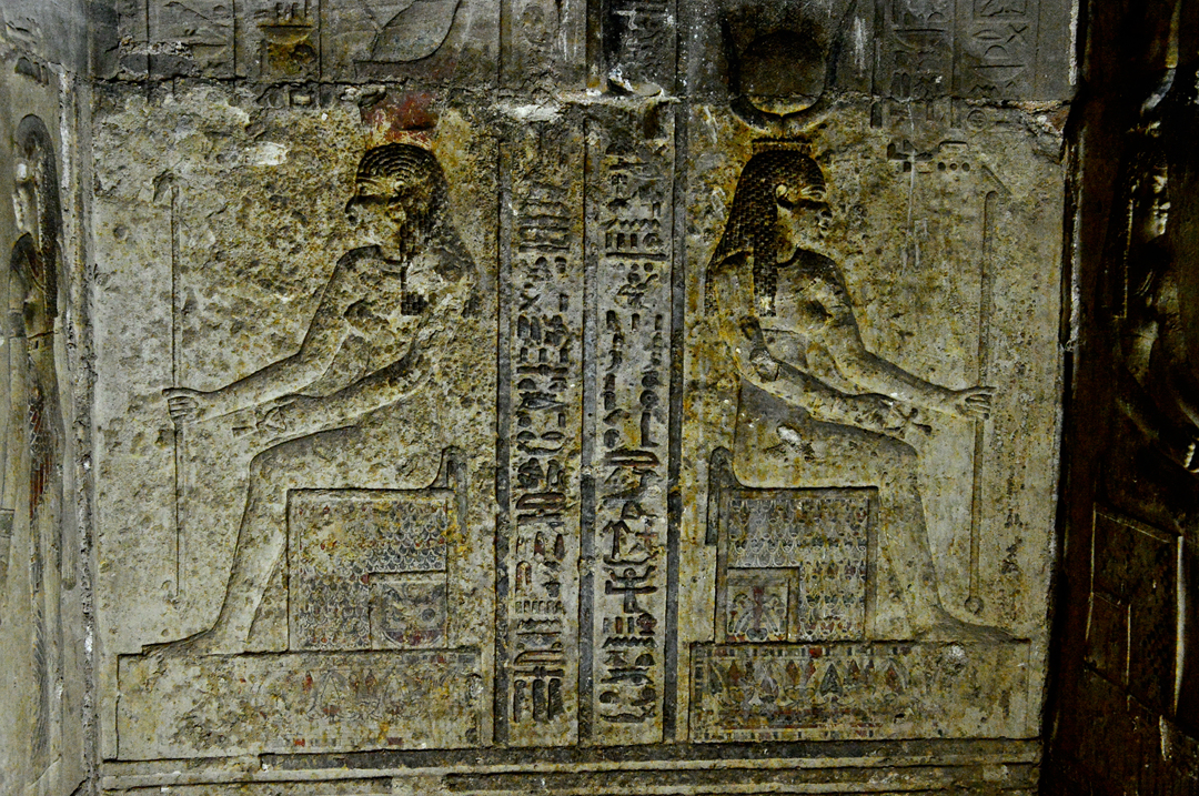 종종 신전 기둥 머리를 장식하는 하트호르 여신 모습도 돋새김으로 새겨져 있다.