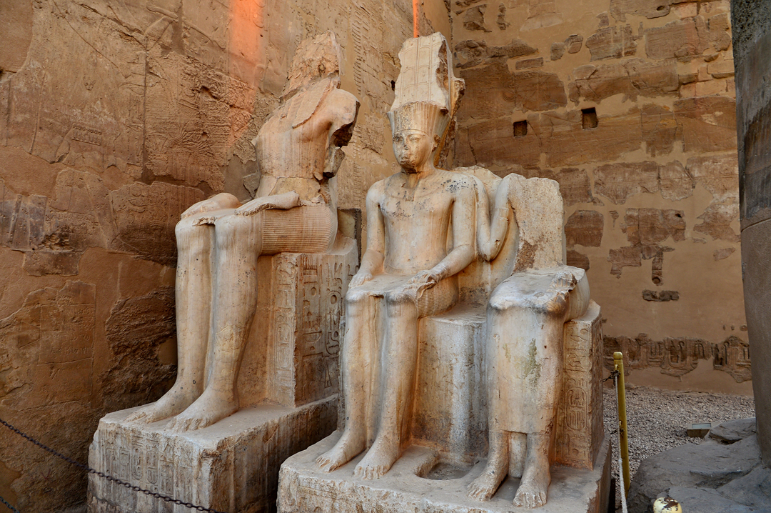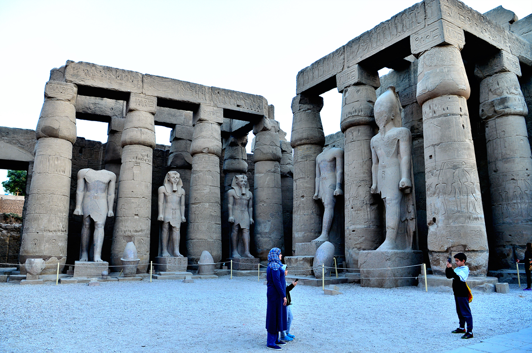 탑문 앞에는 원래 화강암으로 만든 람세스 2세의 좌상 두 체와 입상 네 체가 있었는데,