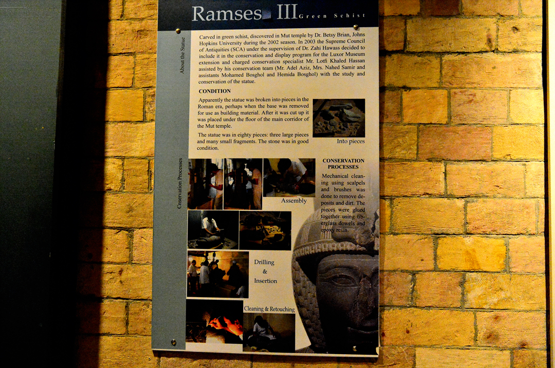볼만한 전시물로는 입구의 오른쪽에 높이 2.15m의 적색 화강암으로 만든 아멘호테프 3세의