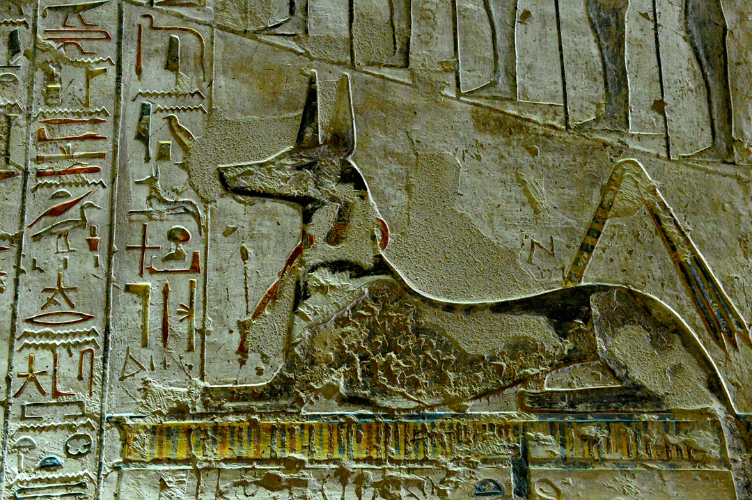 파라오 메렌프타 Merenptah의 무덤 벽에 새겨진 '아누비스'라고 하는 자칼의 모양을 하고 있는