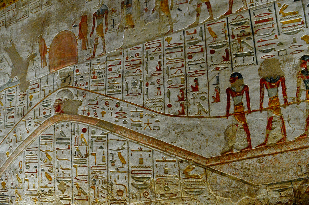 통로의 벽에는 신들 뿐만 아니라 사람들도 그림문자 히에로글리프와 함께 새겨져 있다.