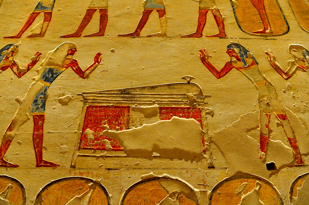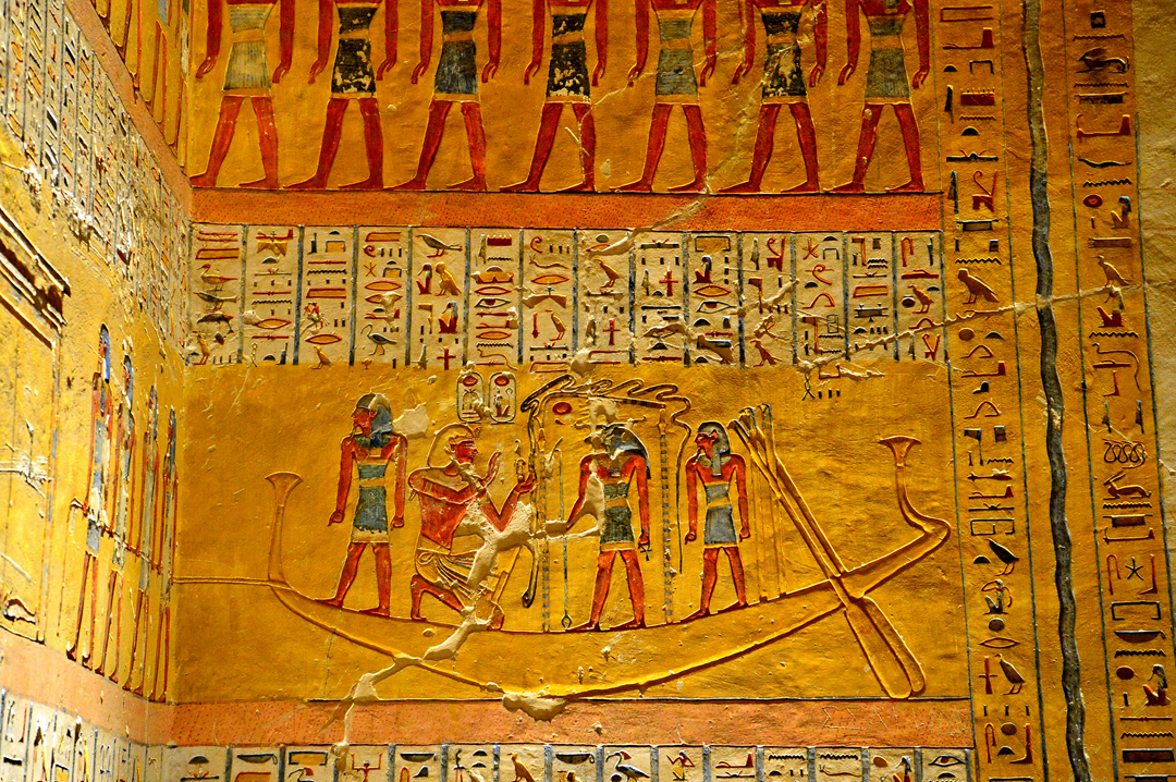 이곳에도 무덤 안쪽에서 보았던 것과 비슷한 거룻배에 탄 신과 파라오의 모습이 새겨져 있다.
