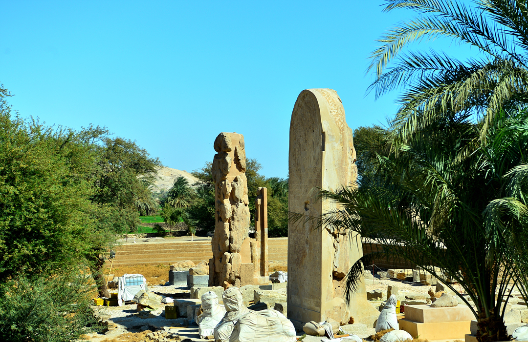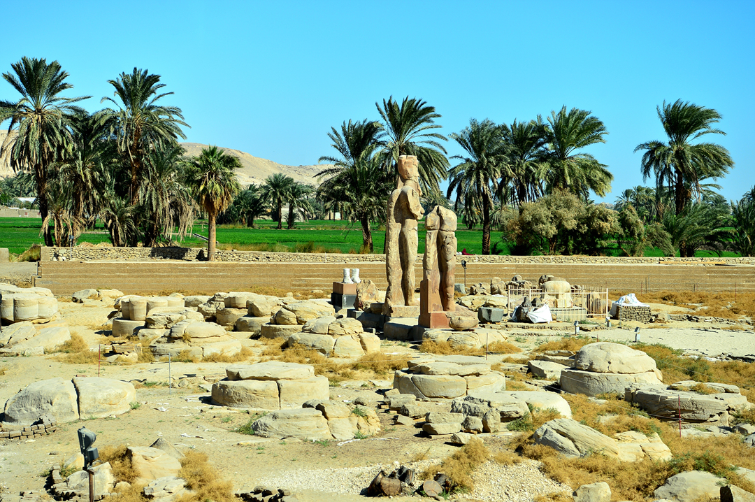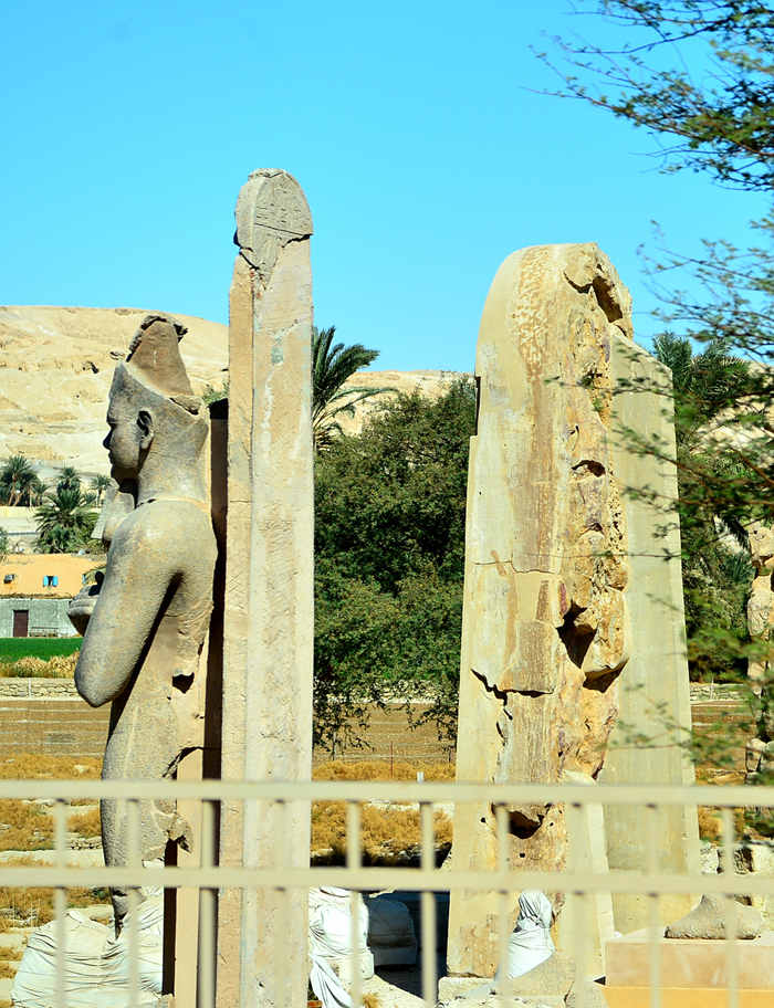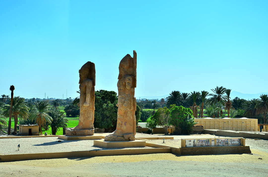아멘호테프 3세가 왕관을 쓰고 앉아 있는 모습의 두 체의 거상만 남아 있다고 한다.
